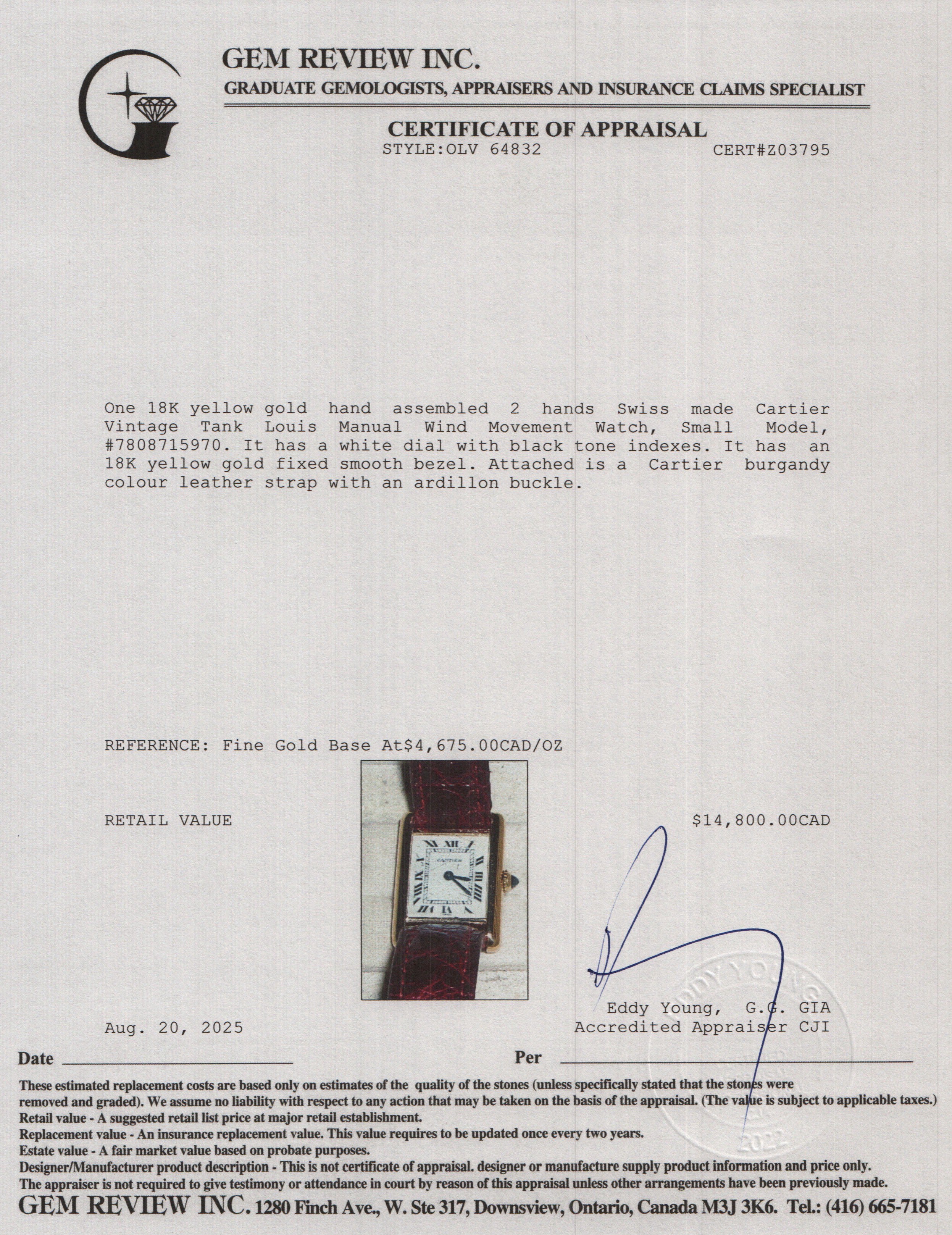 Vintage 18k Yellow Gold Tank Louis Manual Watch, Small Model