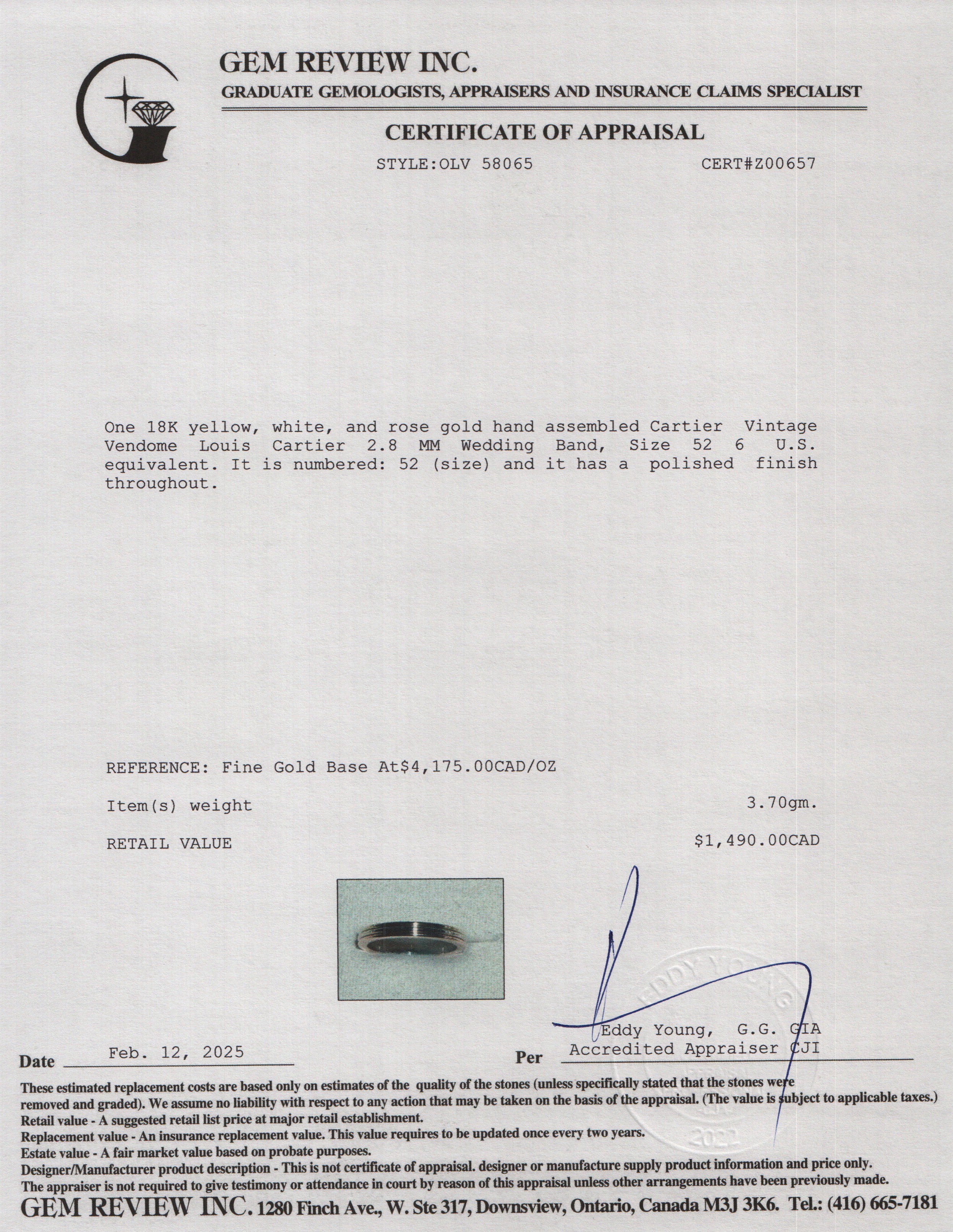 Vintage 18k Yellow, White & Rose Gold Vendome Louis 2.8 MM Wedding Band, Size 52 6
