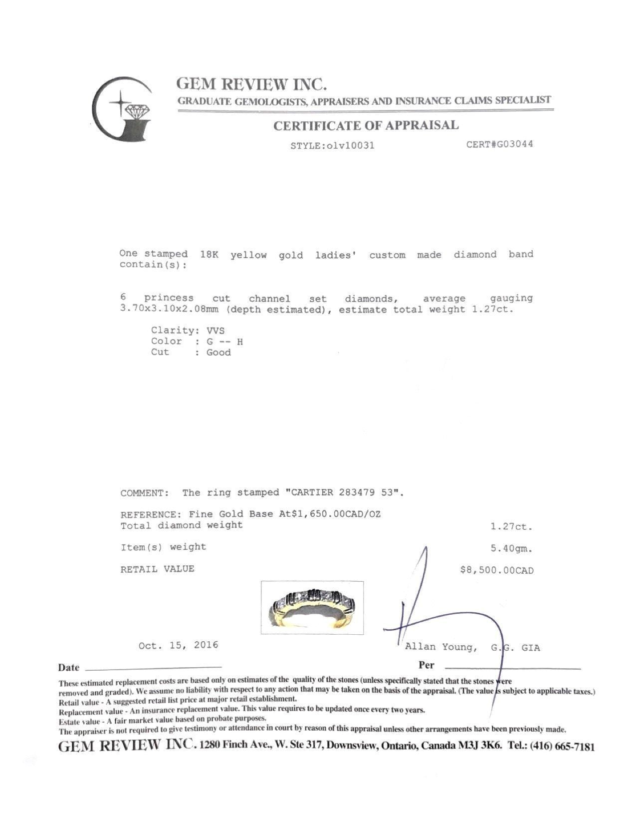 Cartier Vintage Channel Set Diamond Band Ring in 18kt Yellow Gold; Containss 4 Princess Cut Diamonds Totaling Approximately 1.27 ct. of VVS Clarity, G-H Colour; Size 7 1/4; Comes with Gem Review Appraisal
