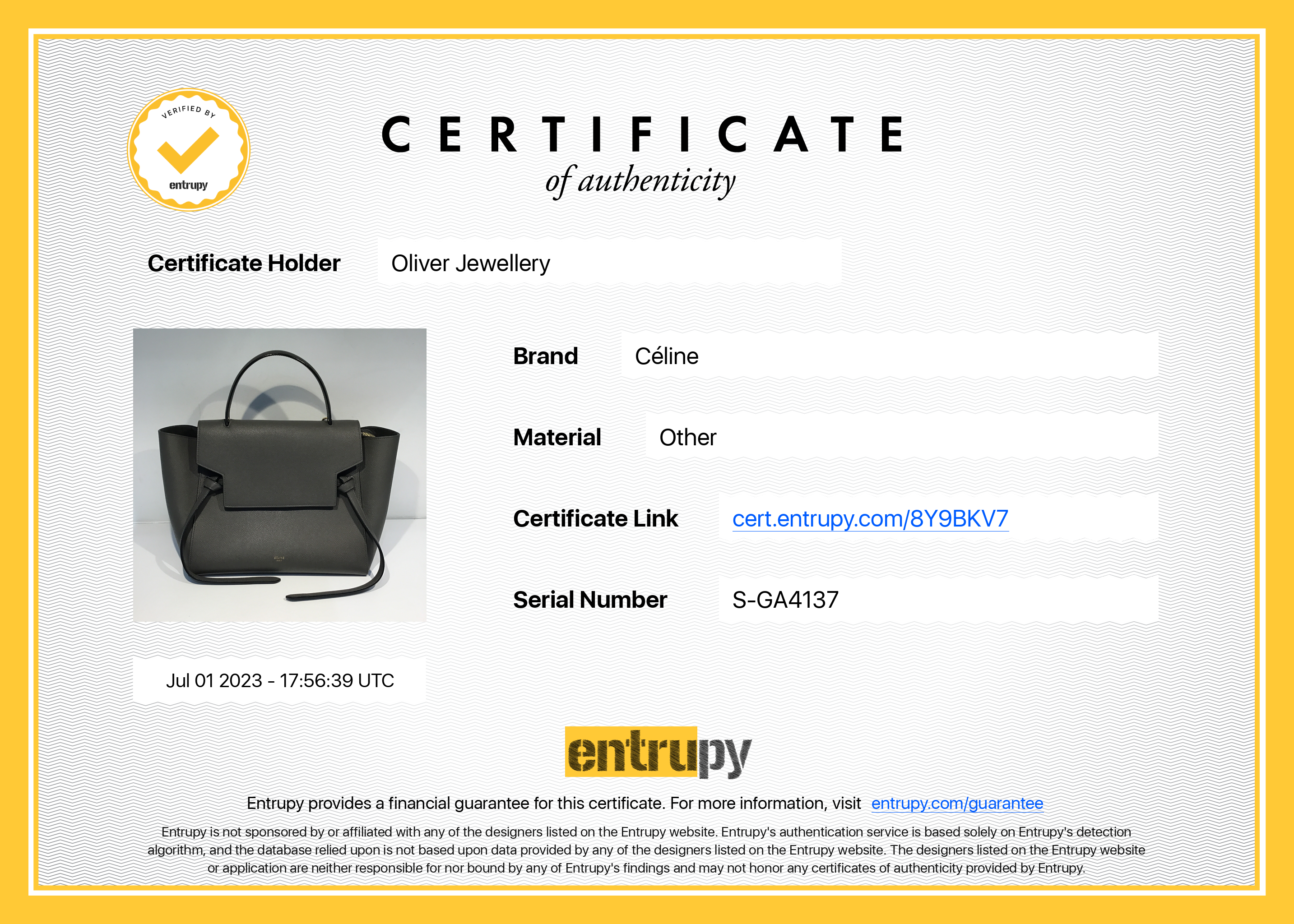 Included Items: Original Celine Dust Bag and Entrupy Certificate of Authenticity #: 8Y9BKV7