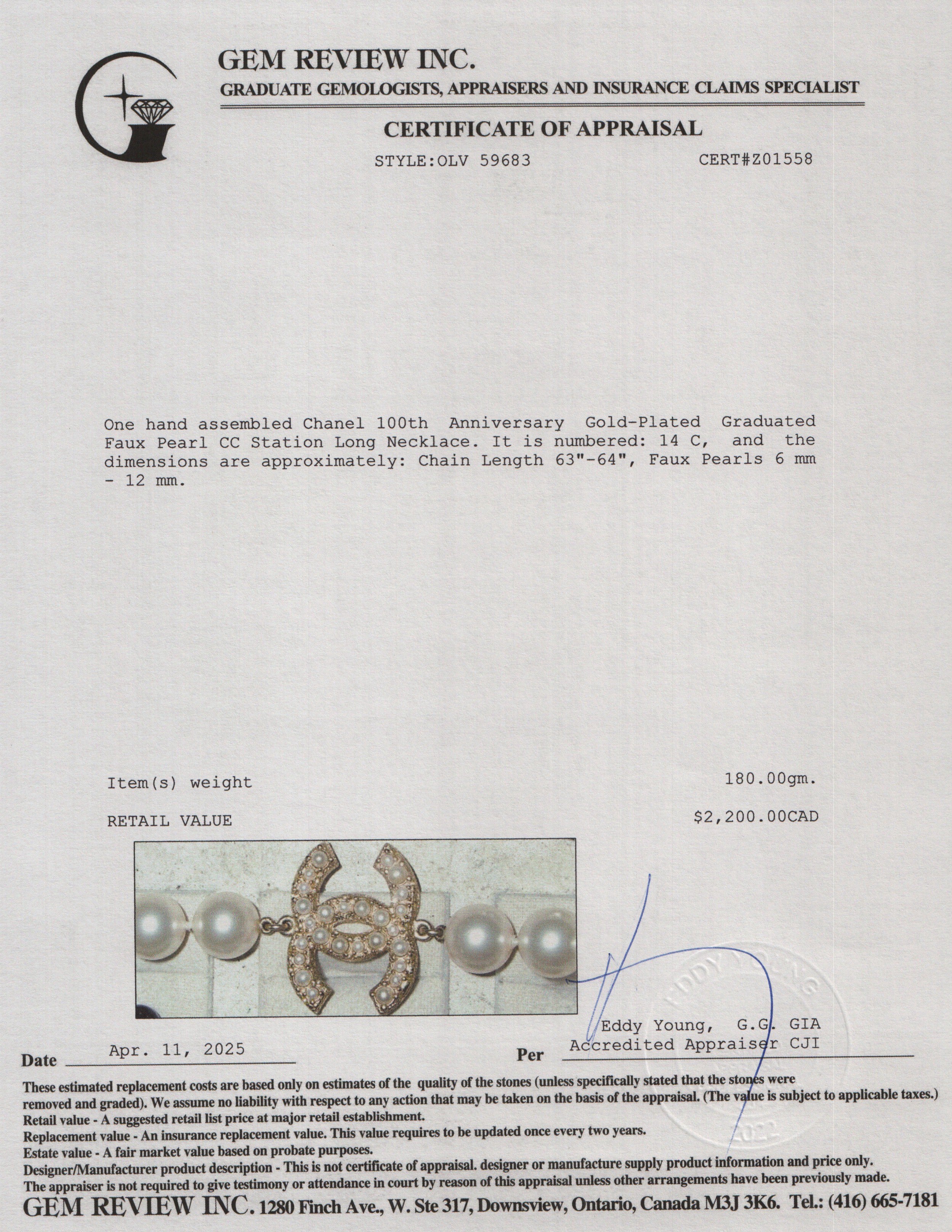 100th Anniversary Gold-Plated Graduated Faux Pearl CC Station Long Necklace w/ Box