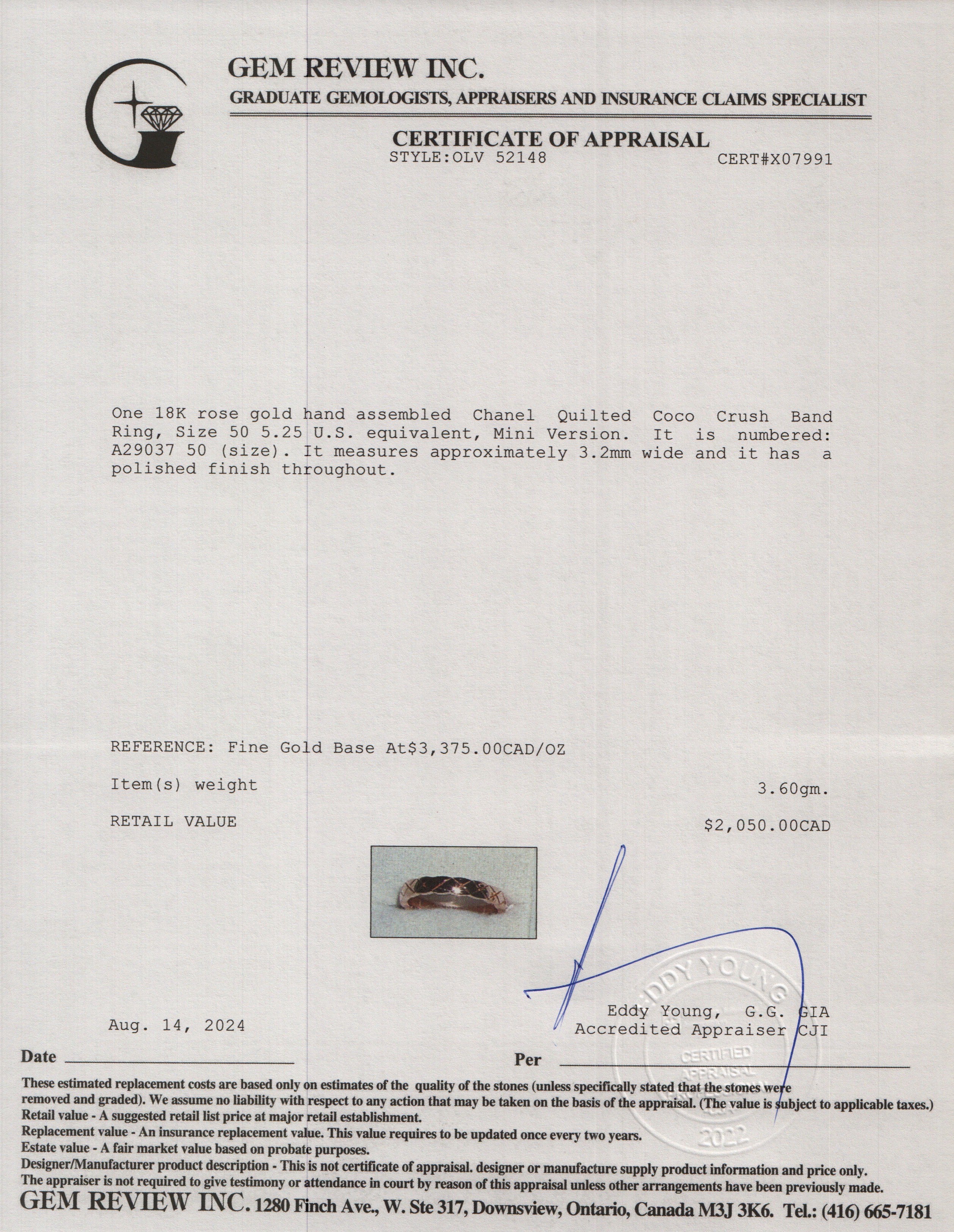 18k Yellow Gold Quilted Coco Crush Band Ring, Size 50 5.25, Mini Version w/ Box