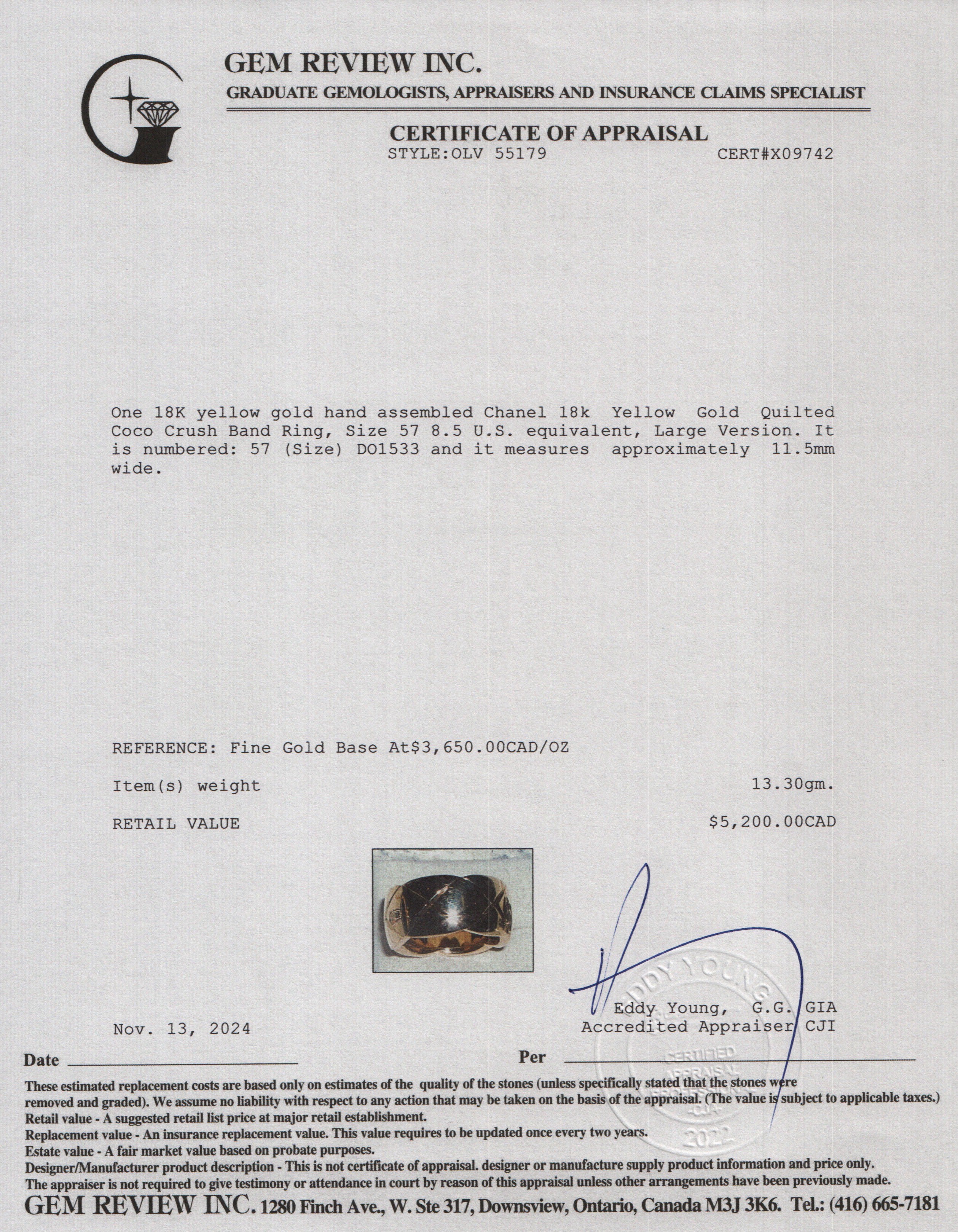 18k Yellow Gold Quilted Coco Crush Band Ring, Size 57 8.5, Large Version w/ Box