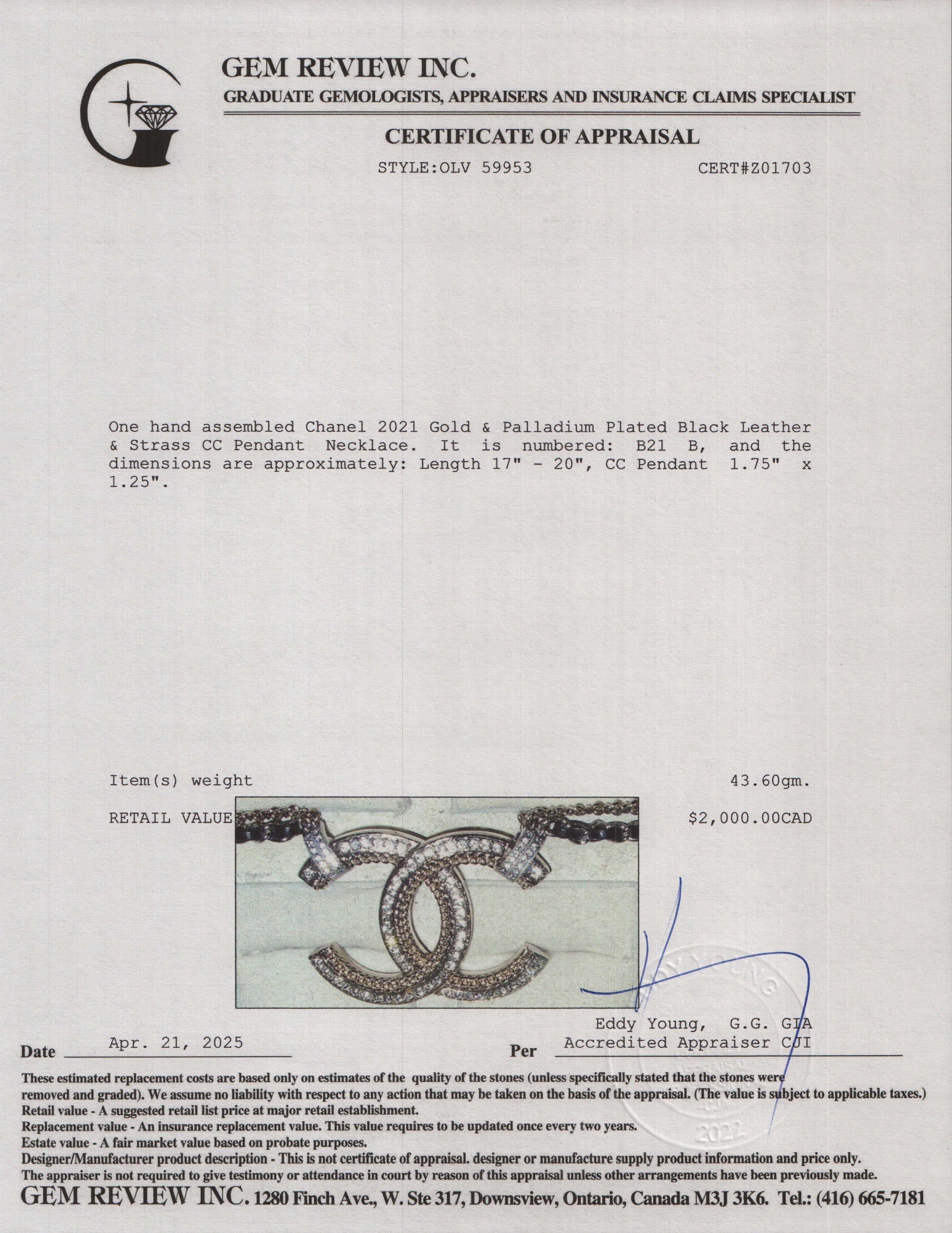 2021 Gold & Palladium Plated Black Leather & Strass CC Pendant Necklace