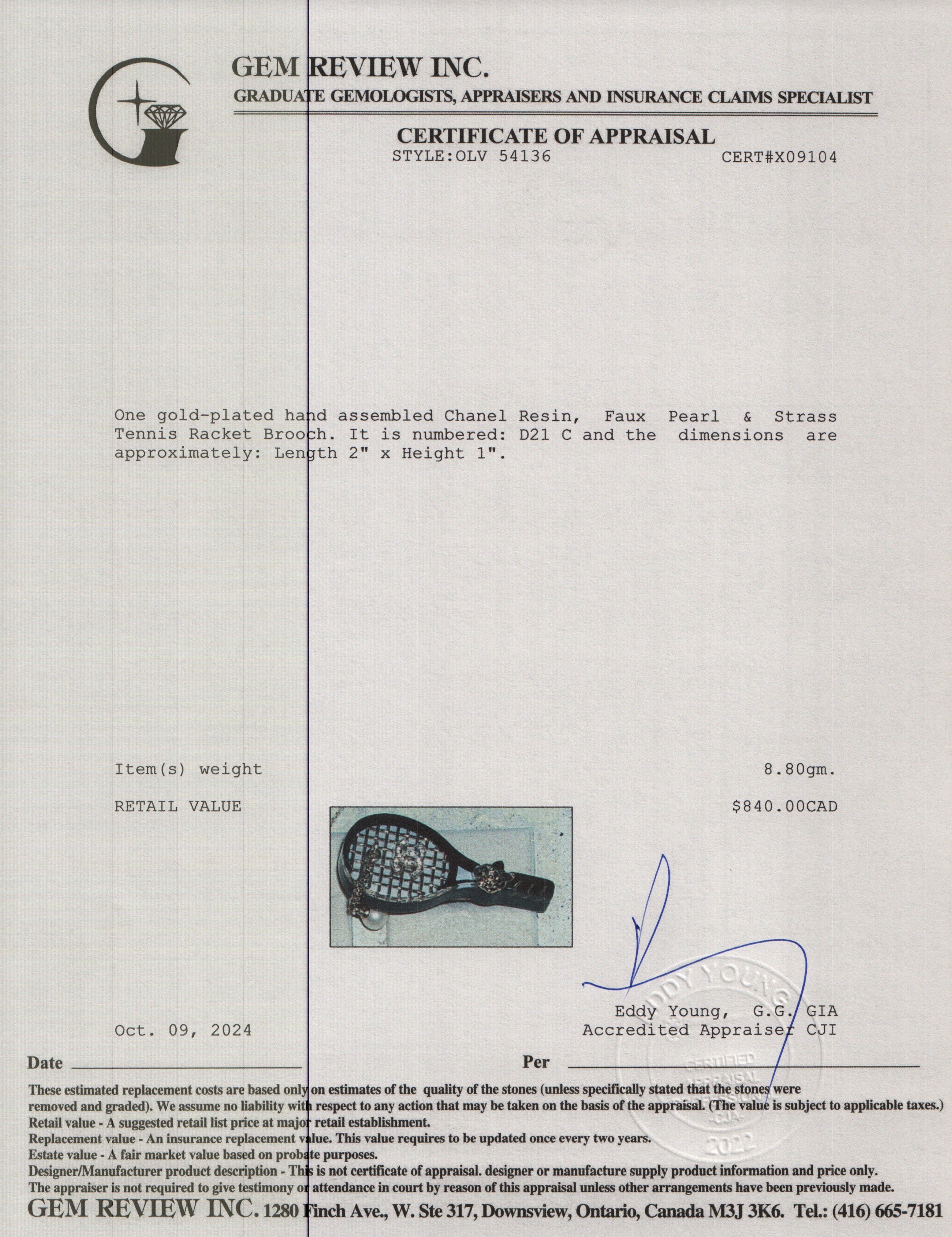 2021 Gold Plated Resin, Faux Pearl & Strass Tennis Racket Brooch