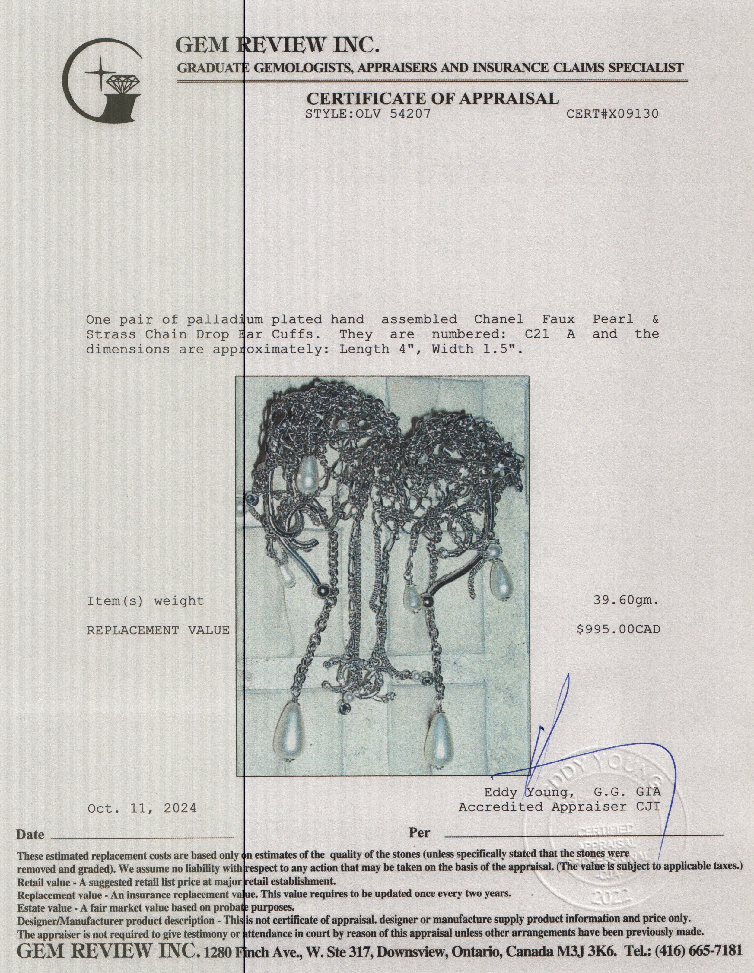 2021 Palladium Plated Faux Pearl & Strass Chain Drop Ear Cuffs w/ Pouch