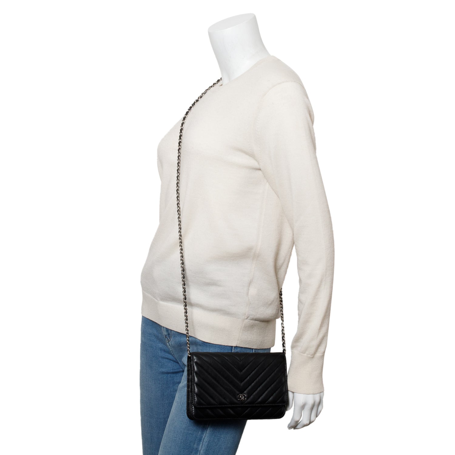 2022 Black Chevron Lambskin Wallet on Chain w/ Box & Receipt
