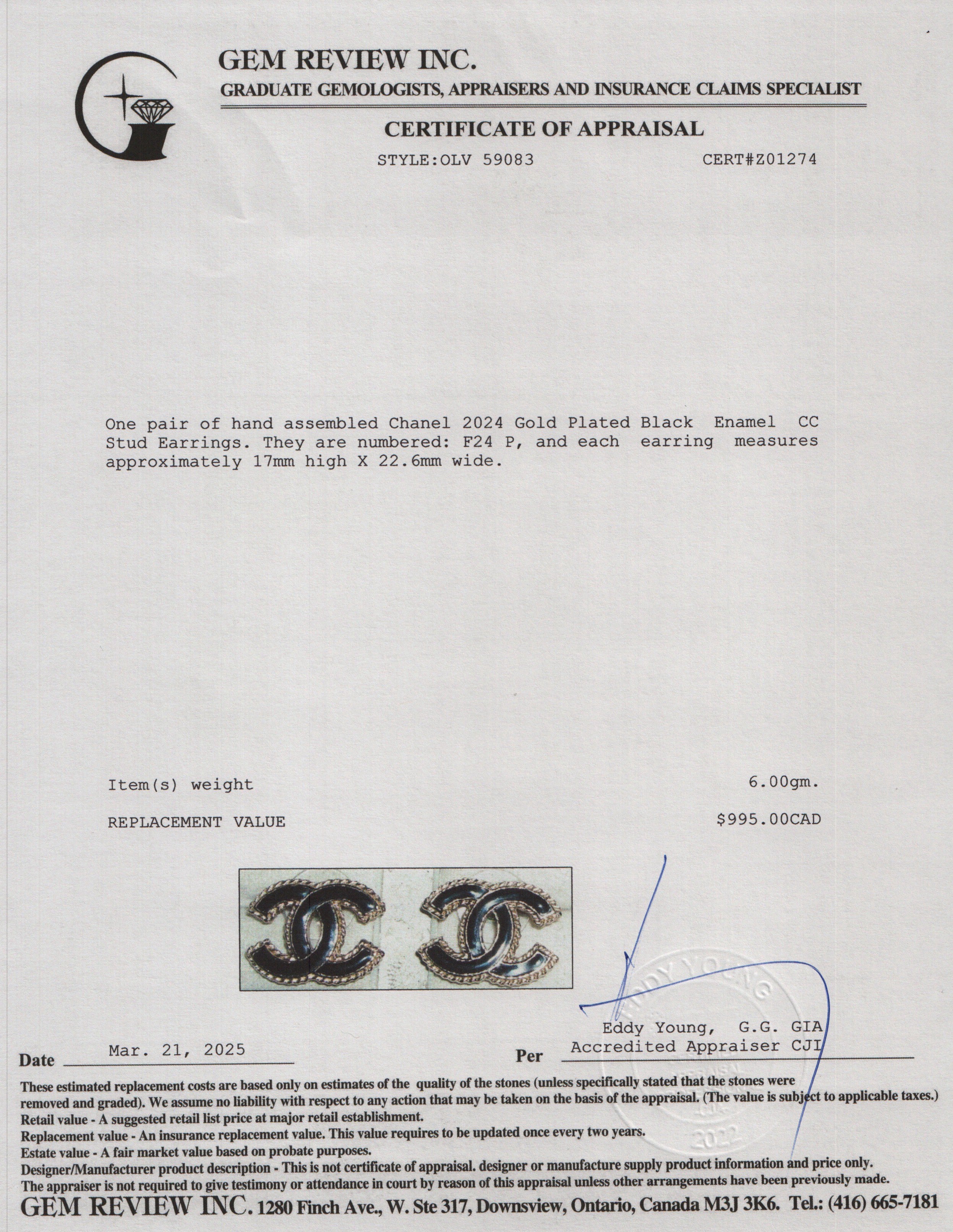 2024 Gold Plated Black Enamel CC Stud Earrings w/ Box