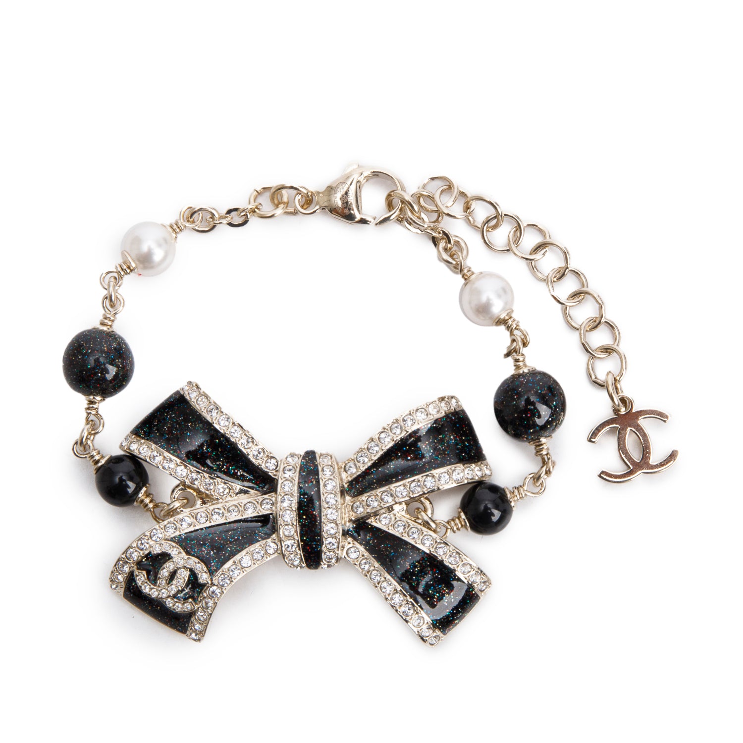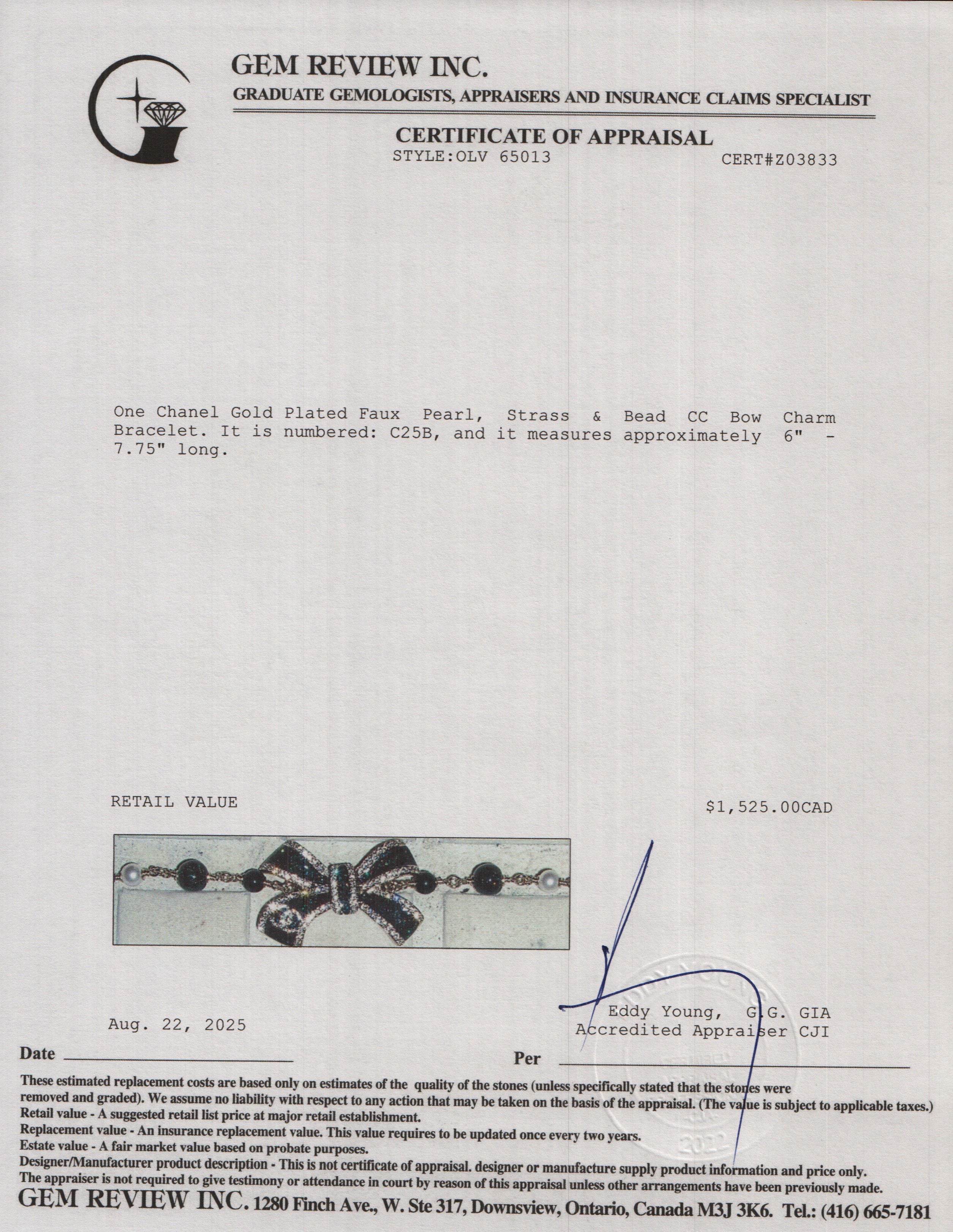 2025 Gold Plated Faux Pearl, Strass & Bead CC Bow Charm Bracelet w/ Box & Receipt