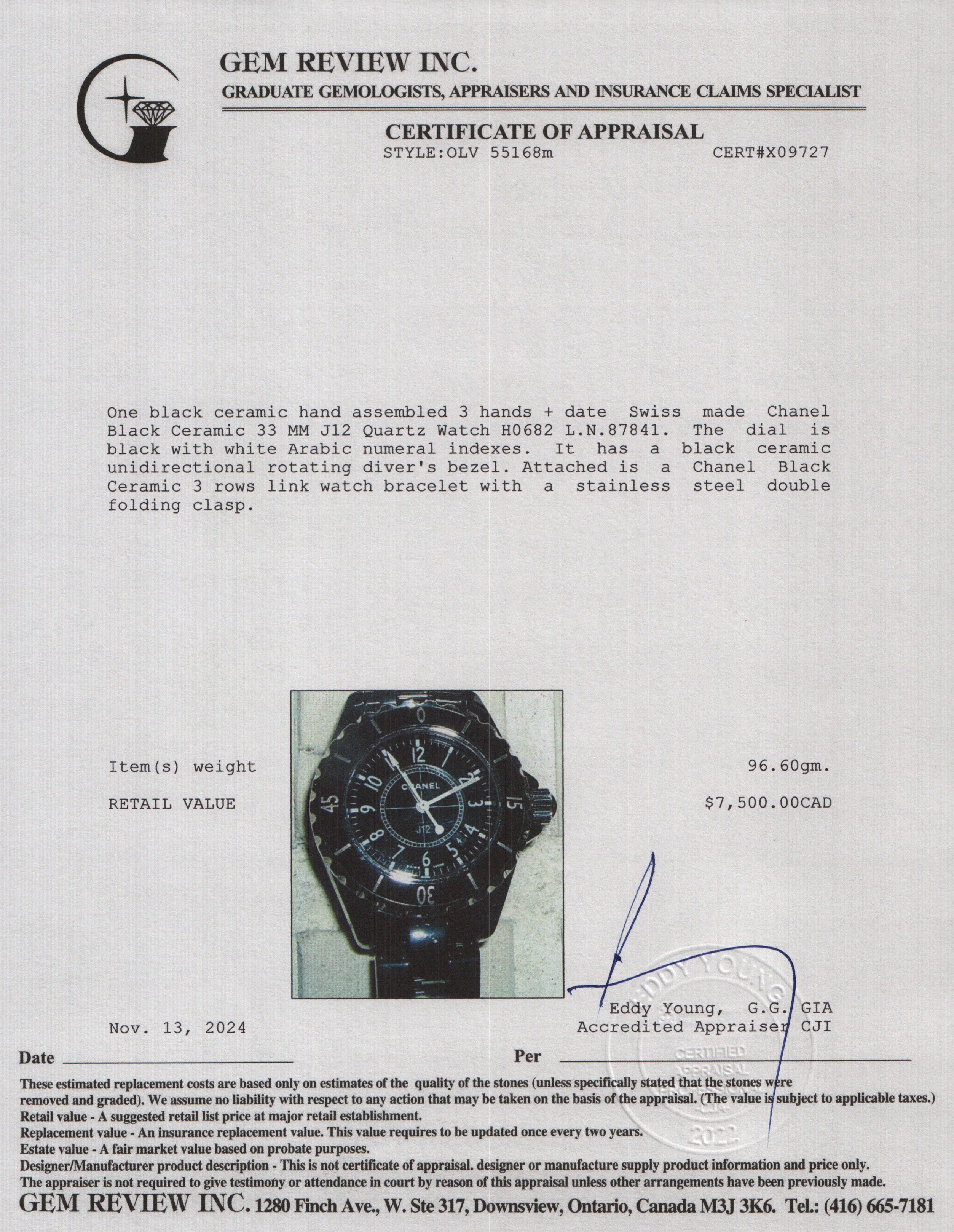 Black Ceramic 33 MM J12 Quartz Watch H0682 w/ Box
