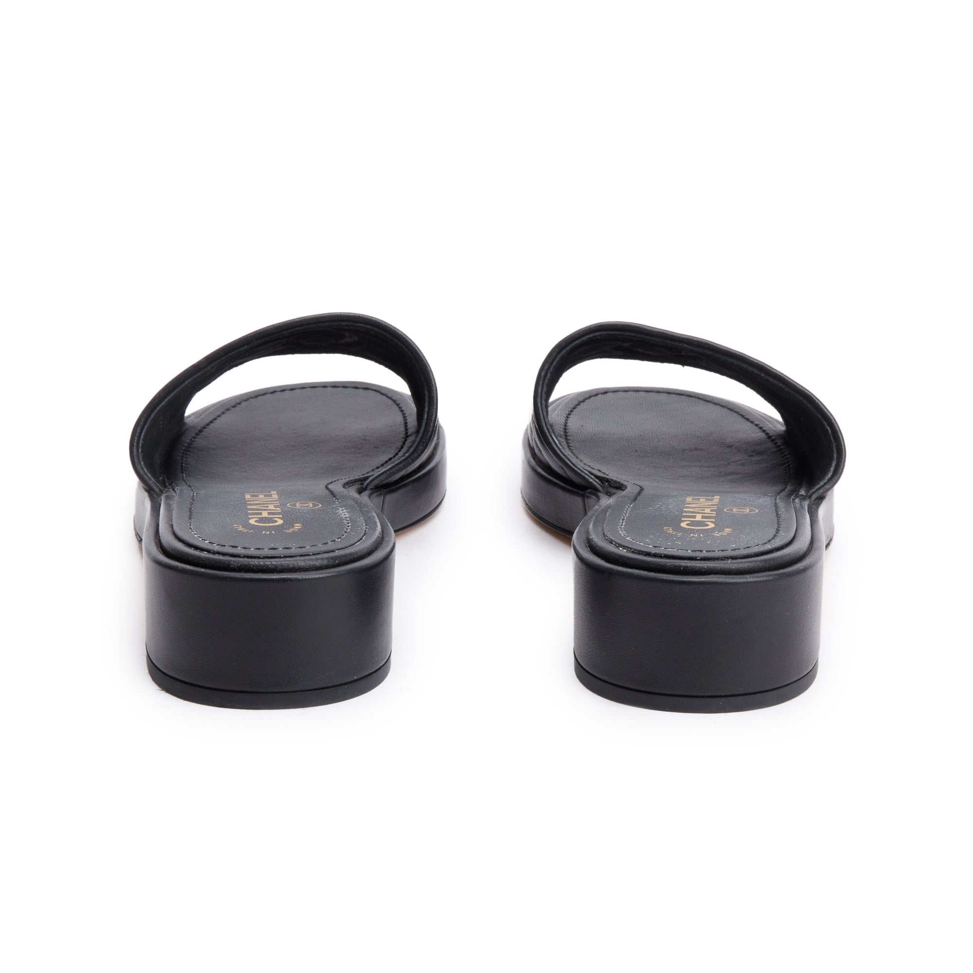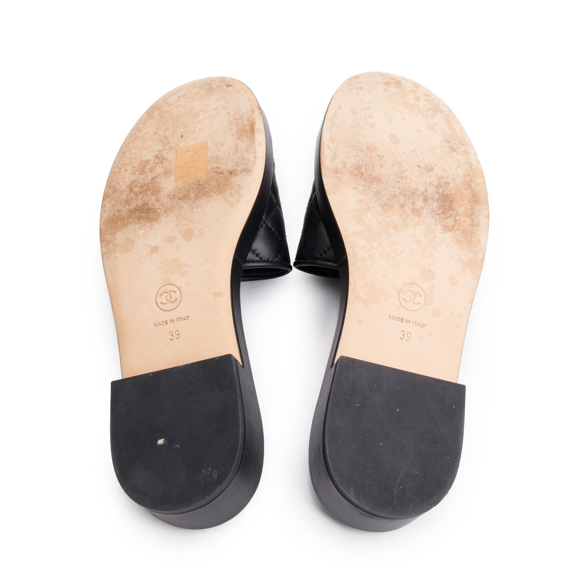 Black Quilted Calfskin Leather CC Slide Sandals, Size 39