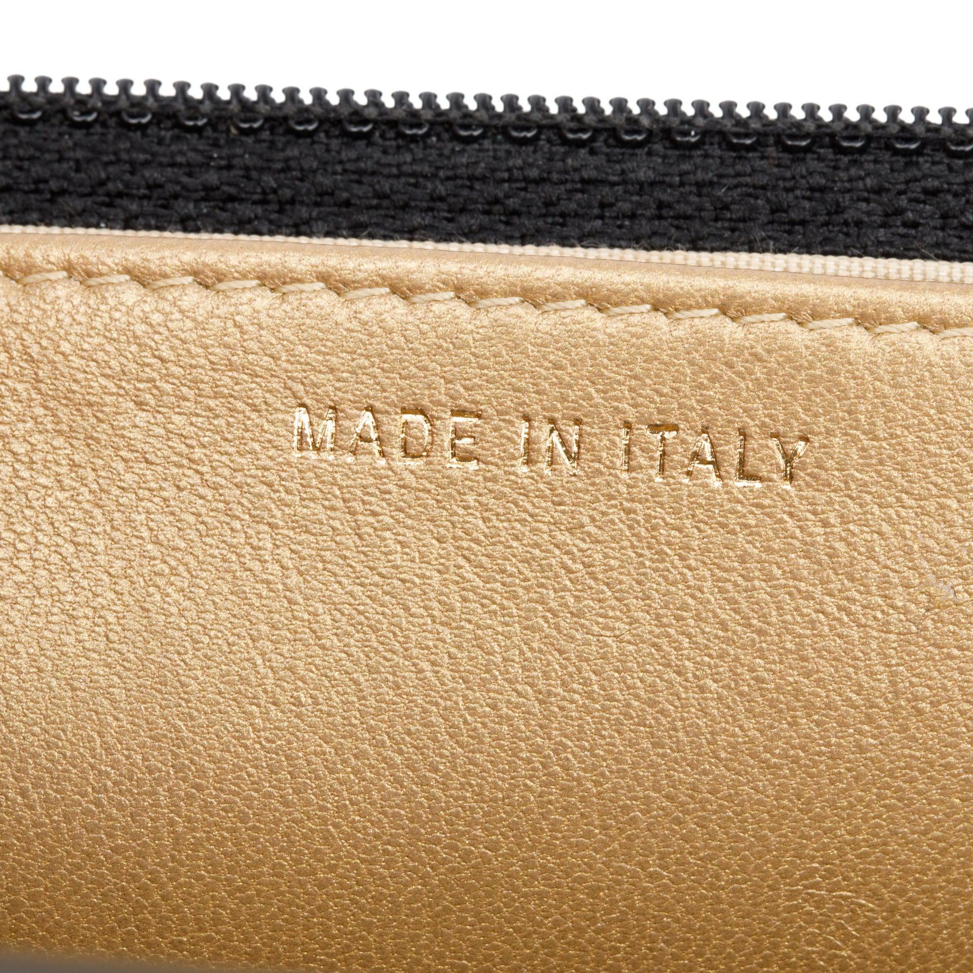 Condition: Very Good, light tarnishing at hardware, slight scuffing at exterior bottom corners, faint scratches at flap underside, slight mark at interior grosgrain lining.
