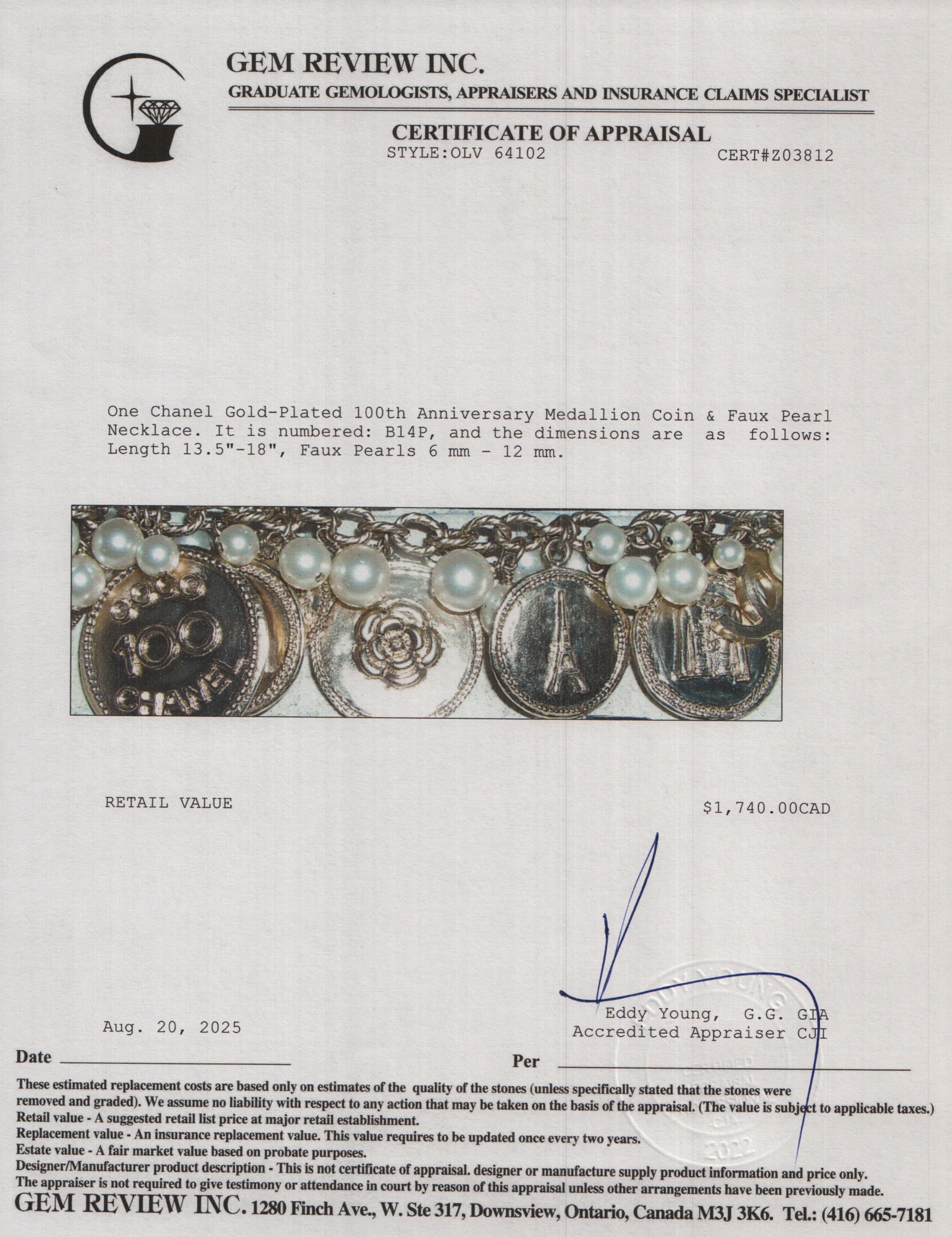 Gold-Plated 100th Anniversary Medallion Coin & Faux Pearl Necklace w/ Box