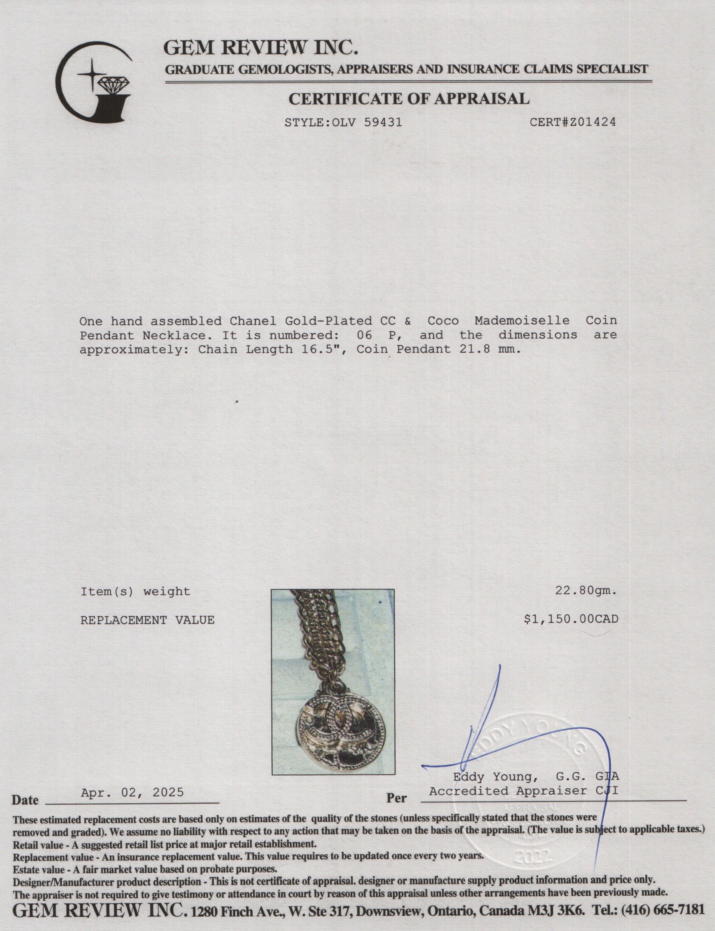 Gold-Plated CC & Coco Mademoiselle Coin Pendant Necklace w/ Box