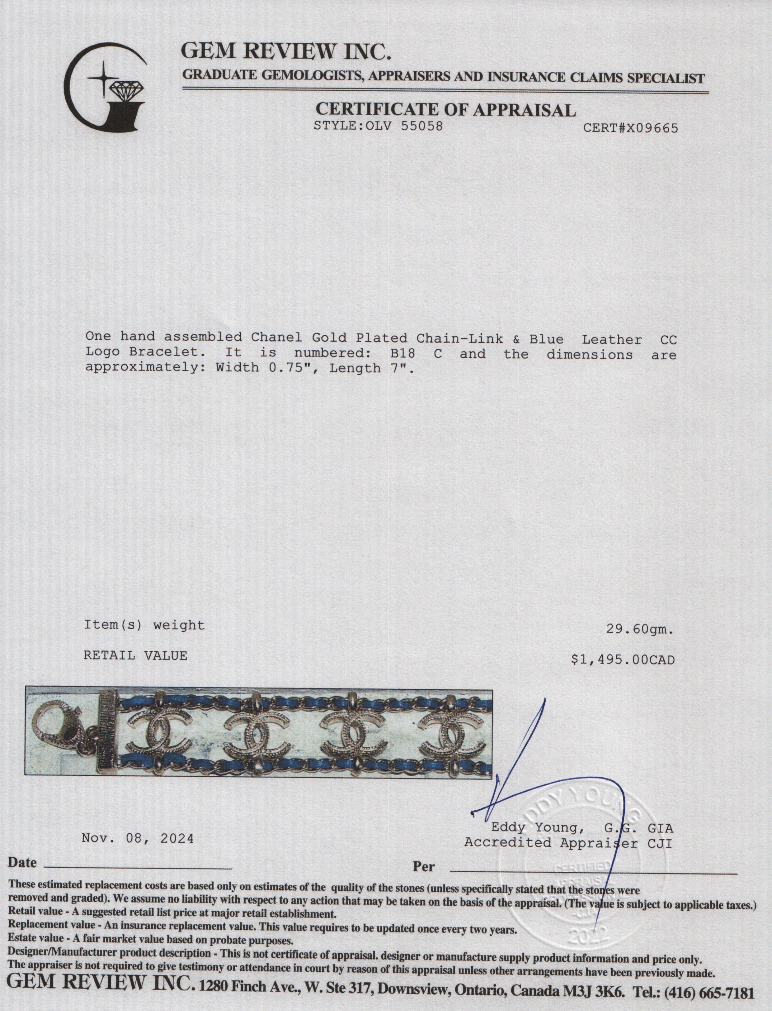 Gold Plated Chain-Link & Blue Leather CC Logo Bracelet