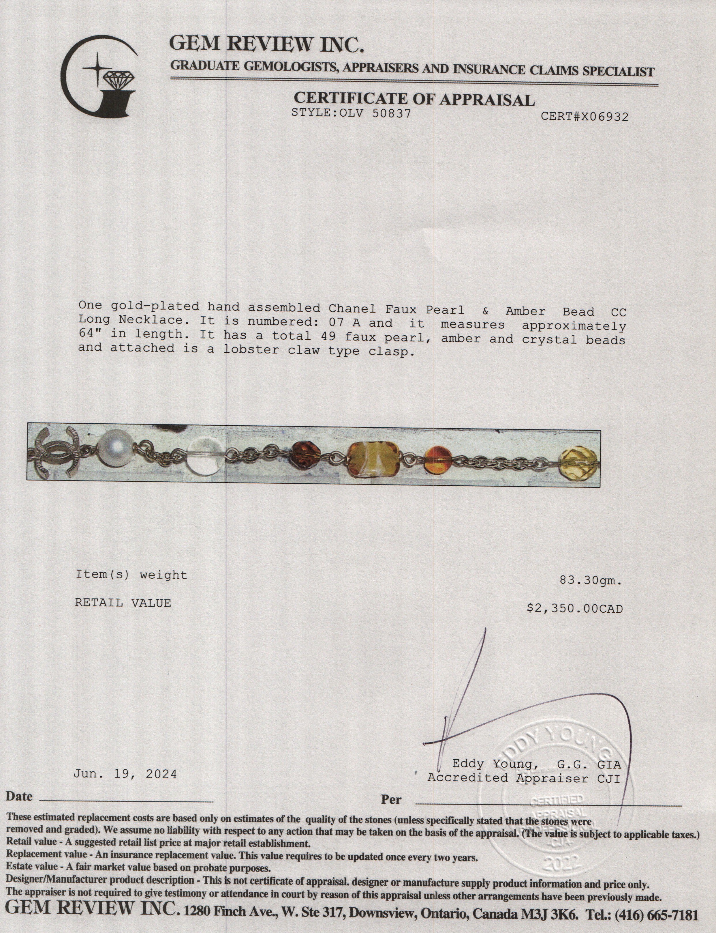 Gold Plated Faux Pearl & Amber Bead CC Long Necklace