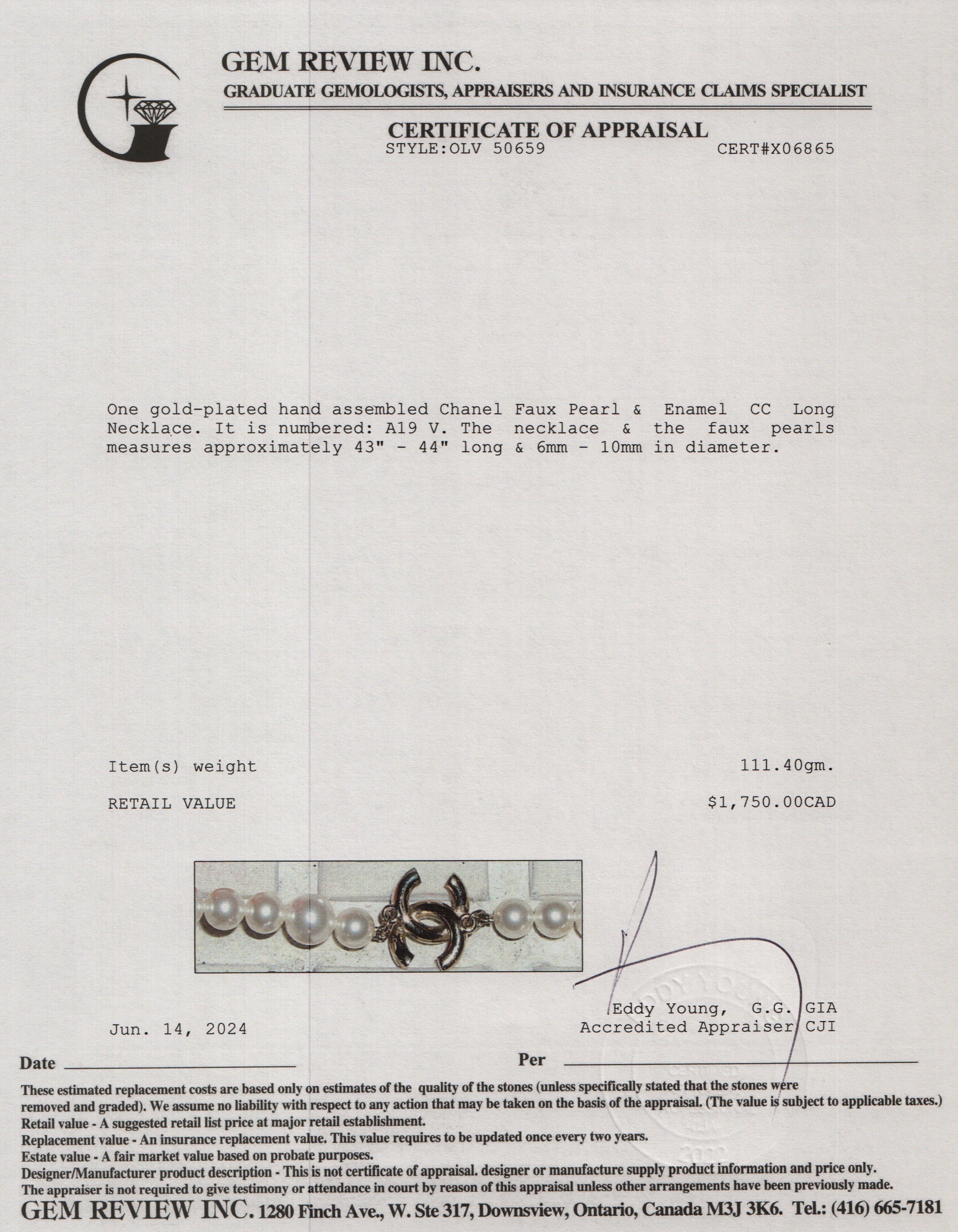 Gold Plated Faux Pearl & Enamel CC Long Necklace w/ Box