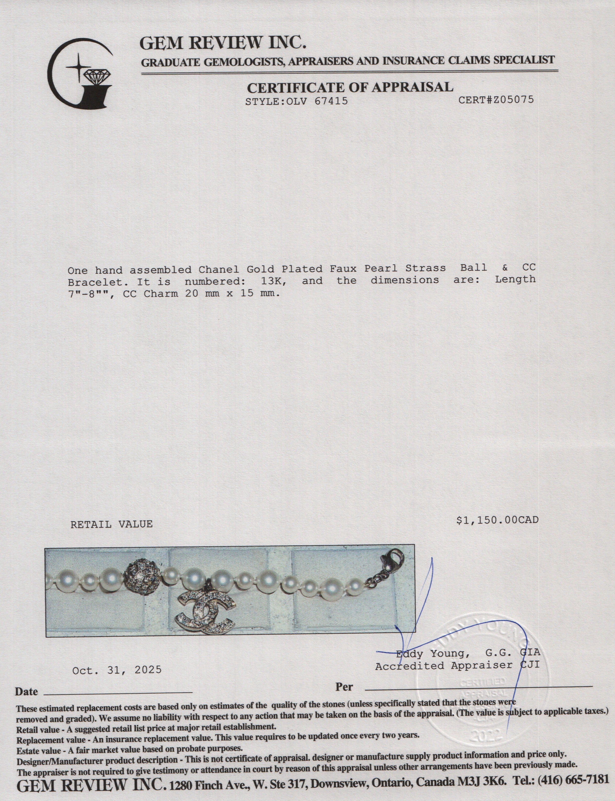 Gold Plated Faux Pearl Strass Ball & CC Bracelet