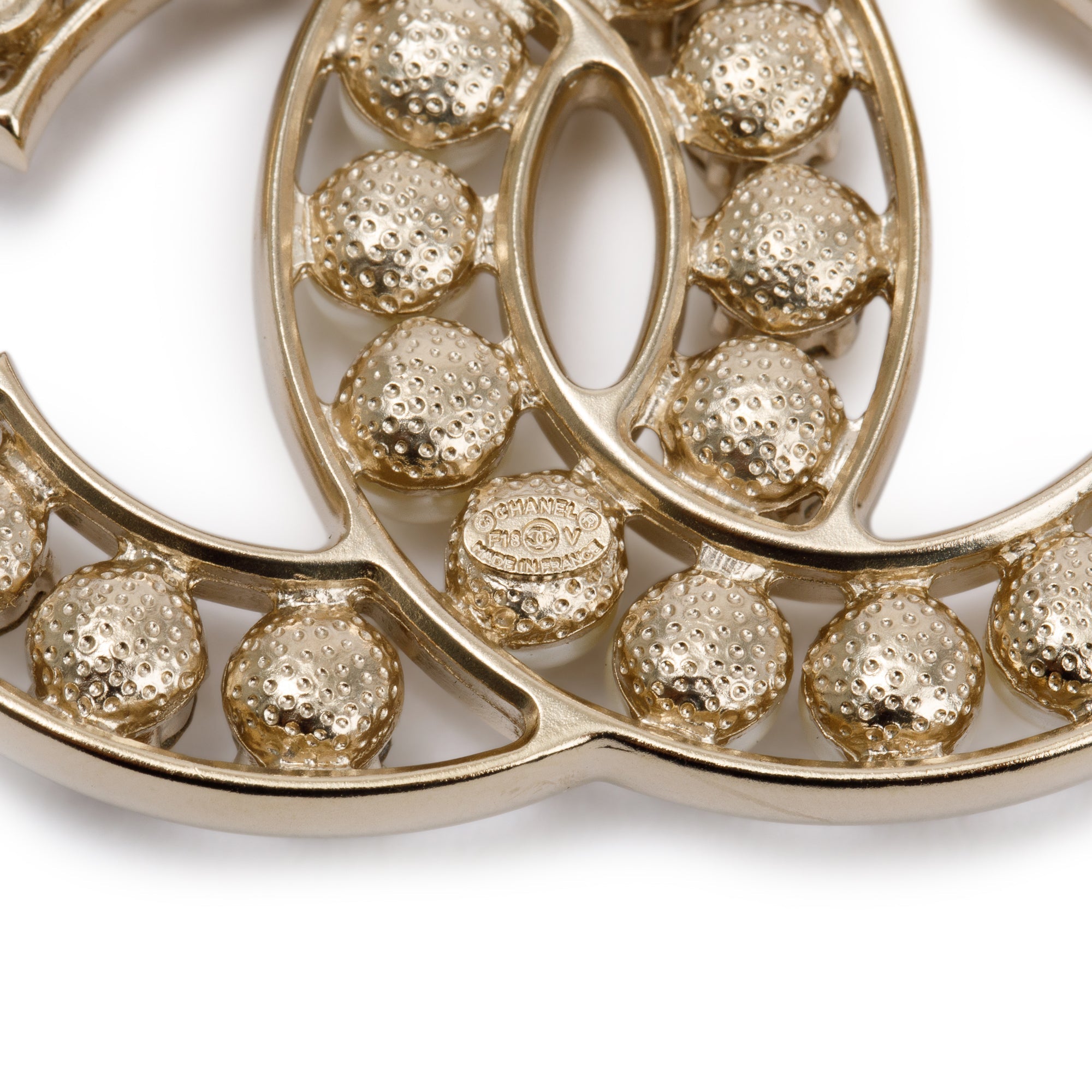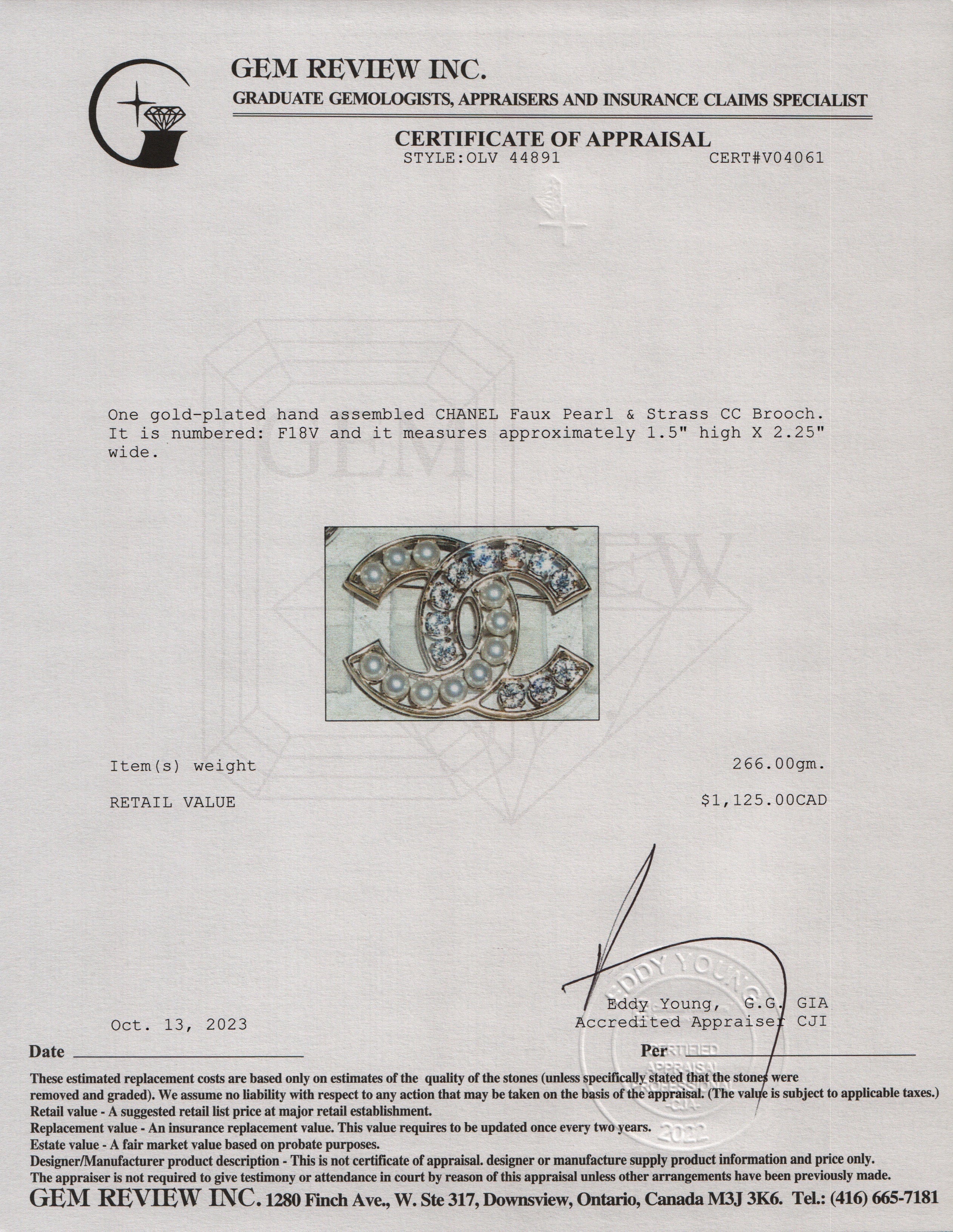 Gold Plated Faux Pearl & Strass CC Brooch w/ Box