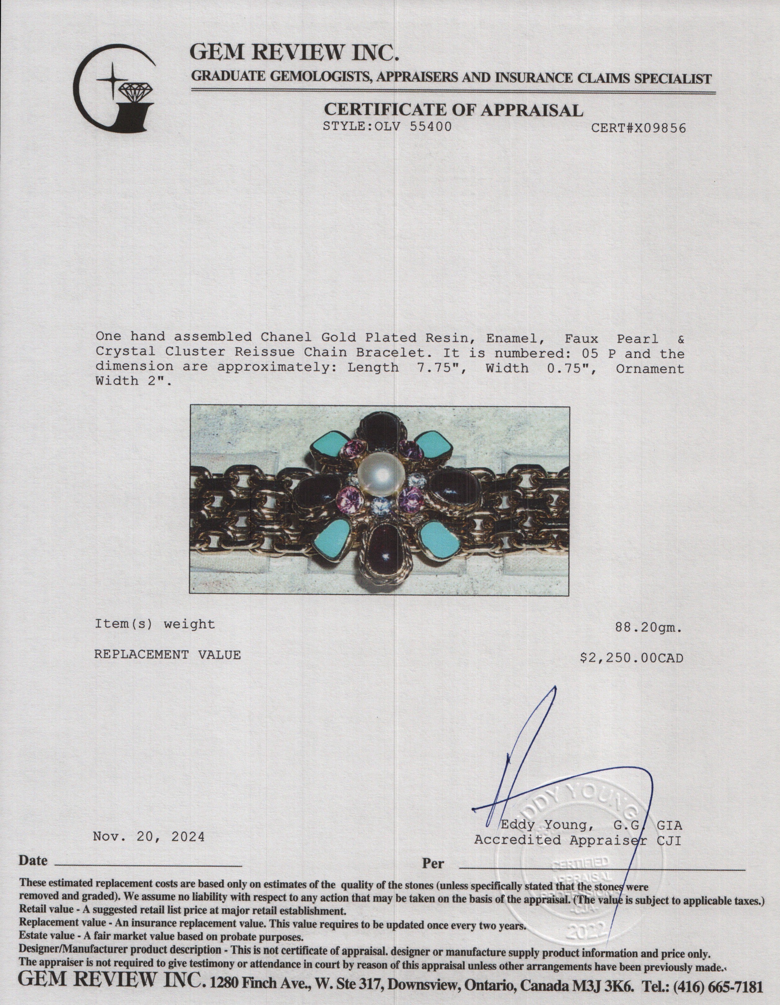 Gold Plated Resin, Enamel, Faux Pearl & Crystal Cluster Reissue Chain Bracelet