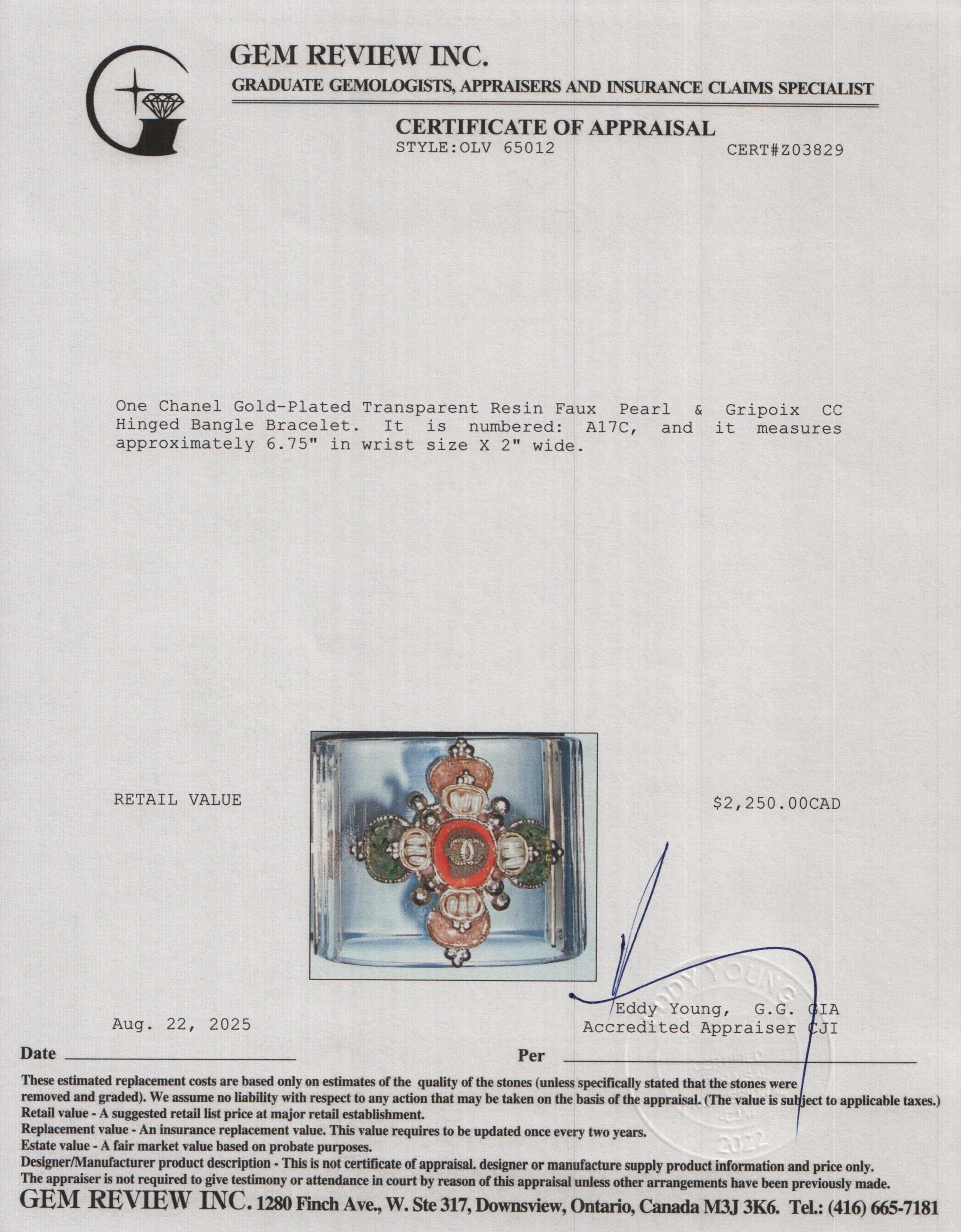 Gold-Plated Transparent Resin Faux Pearl & Gripoix CC Hinged Bangle Bracelet w/ Box