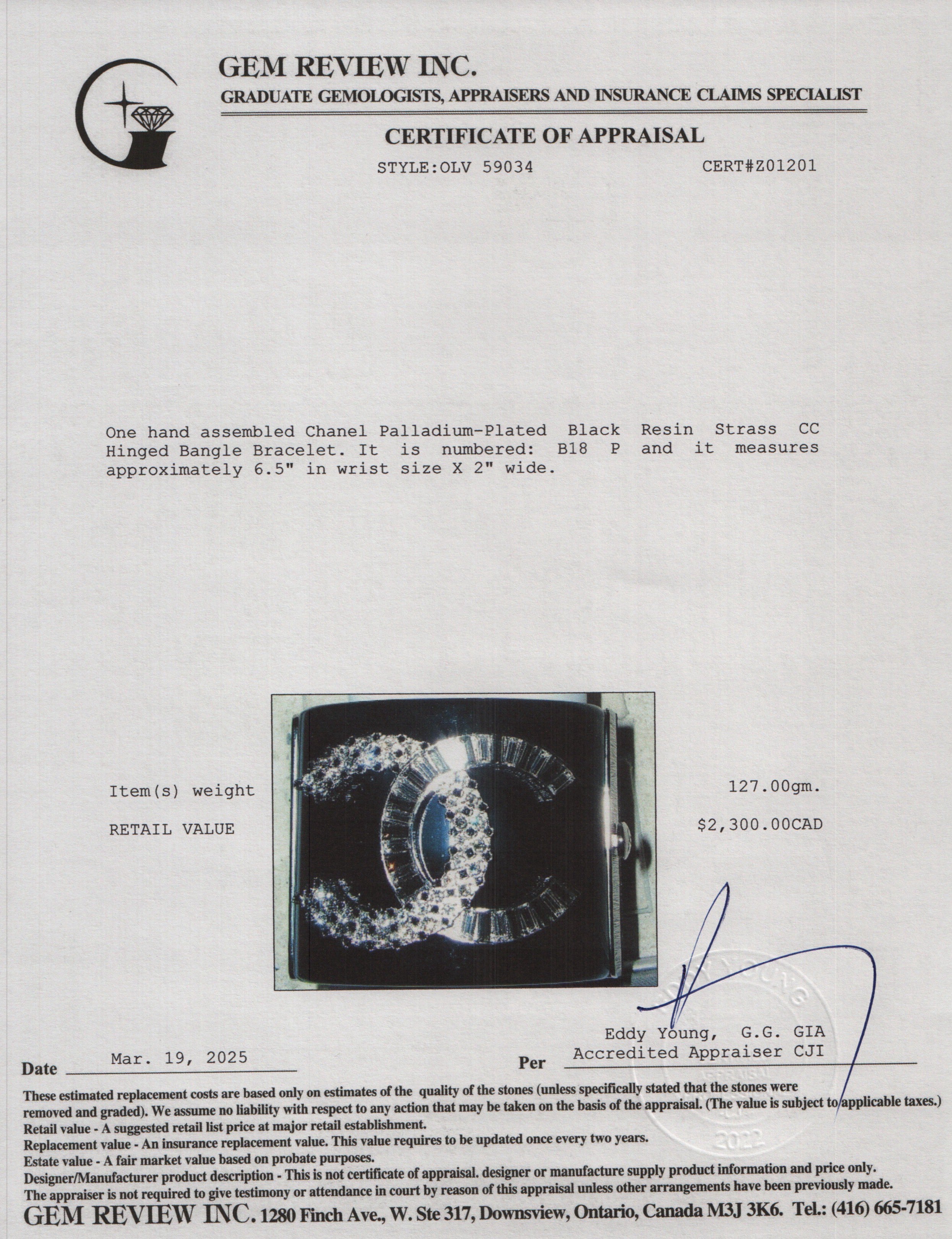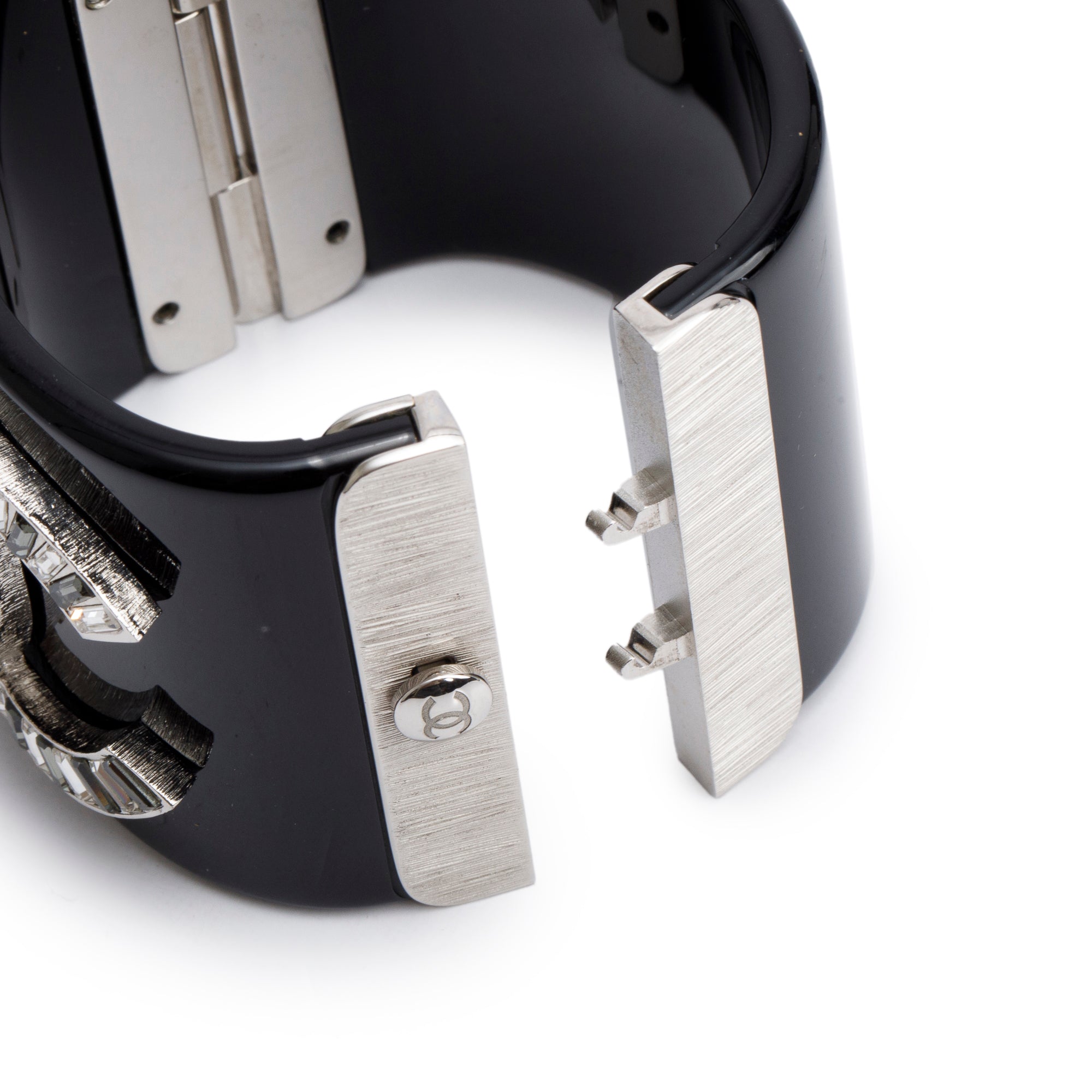 Palladium-Plated Black Resin Strass CC Hinged Bangle Bracelet w/ Box