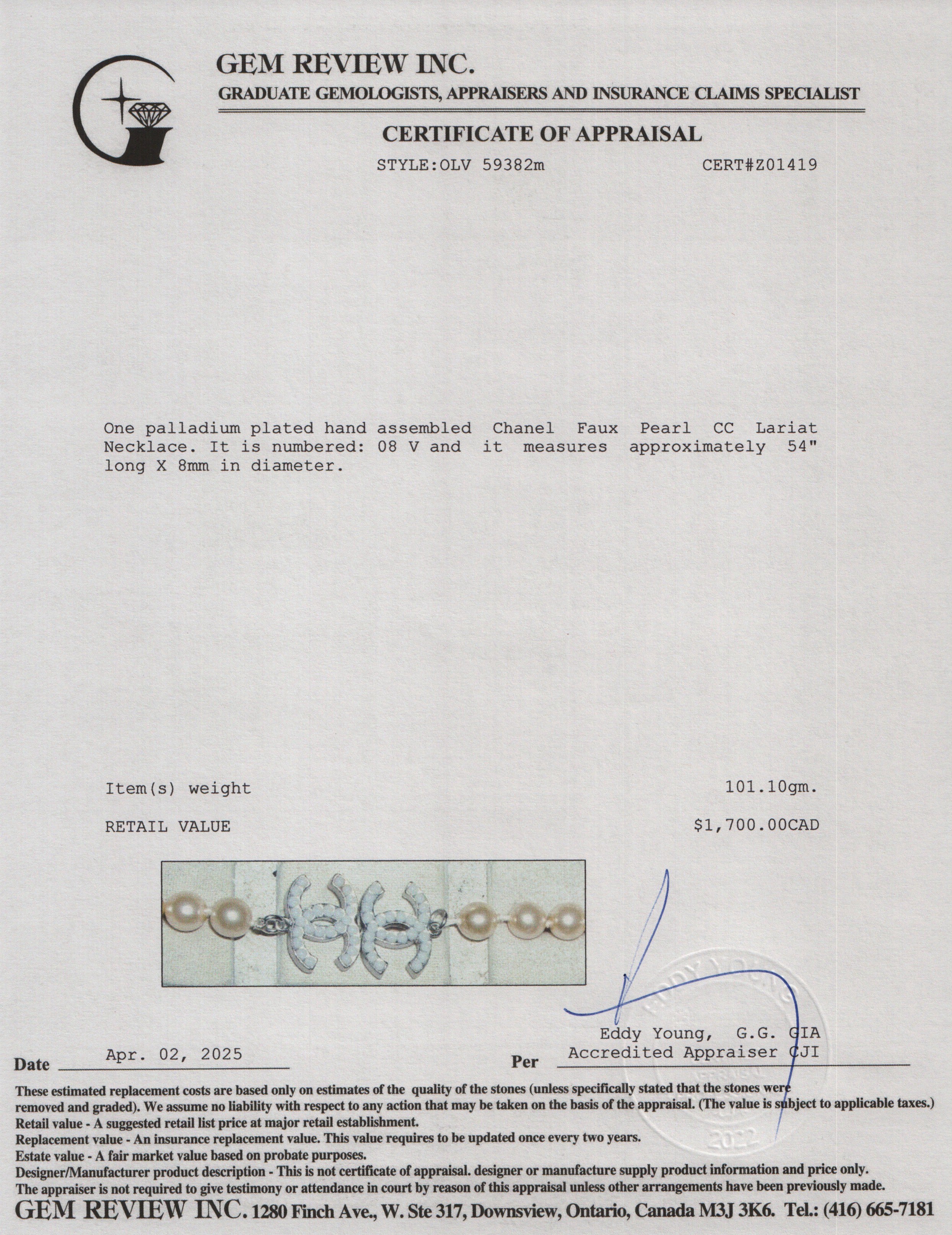 Palladium-Plated Faux Pearl CC Lariat Necklace w/ Box