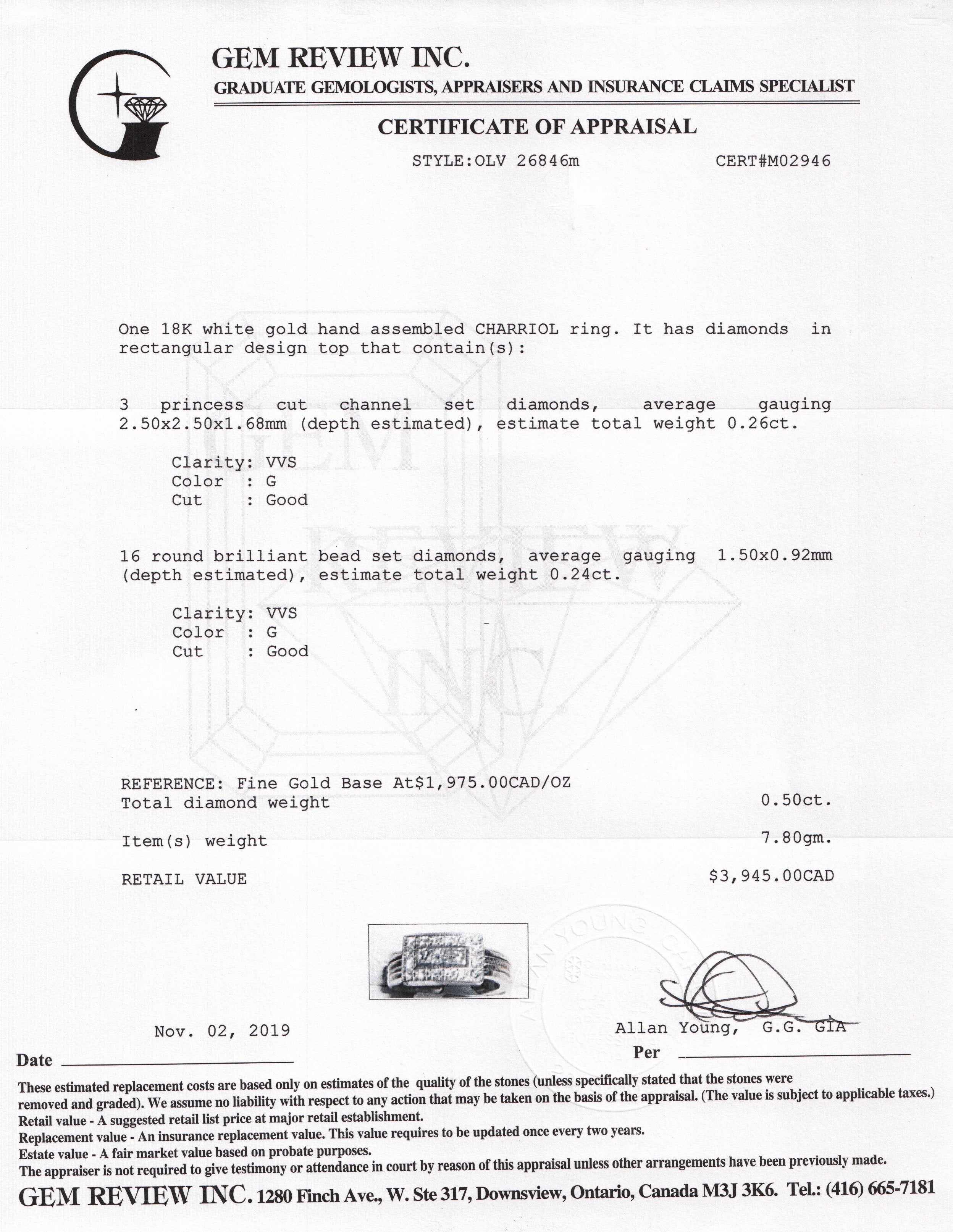 - 3 Princess Cut Channel-Set Diamonds Totalling Approximately 0.26 ct. of VVS Clarity, G Colour, Good Cut