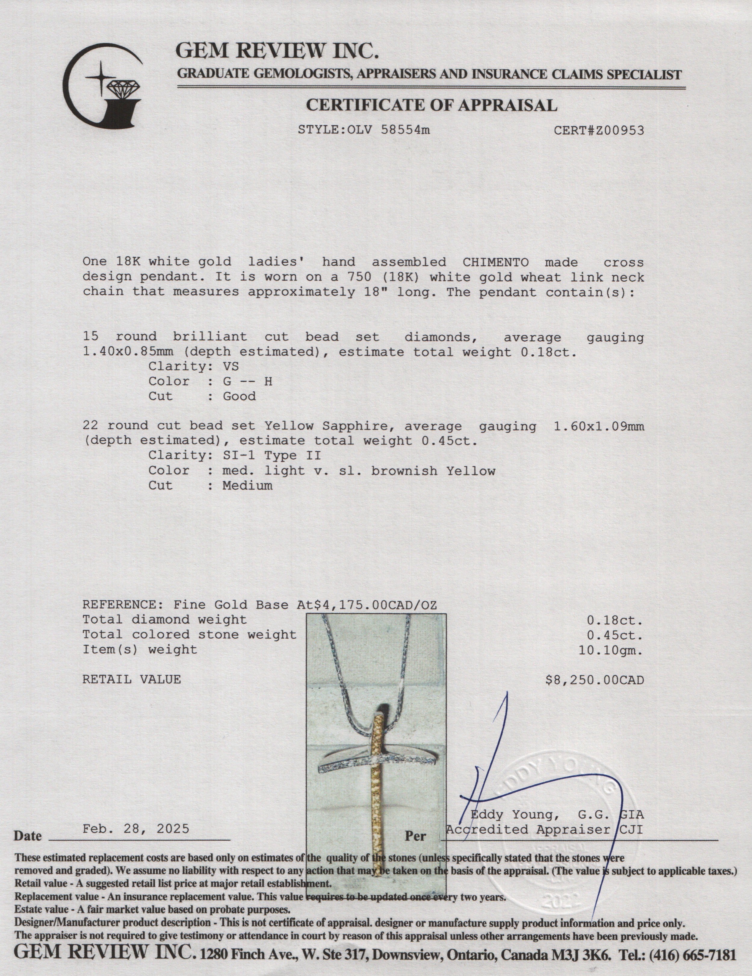 18k White Gold Yellow Sapphire & Diamond Cross Pendant Necklace