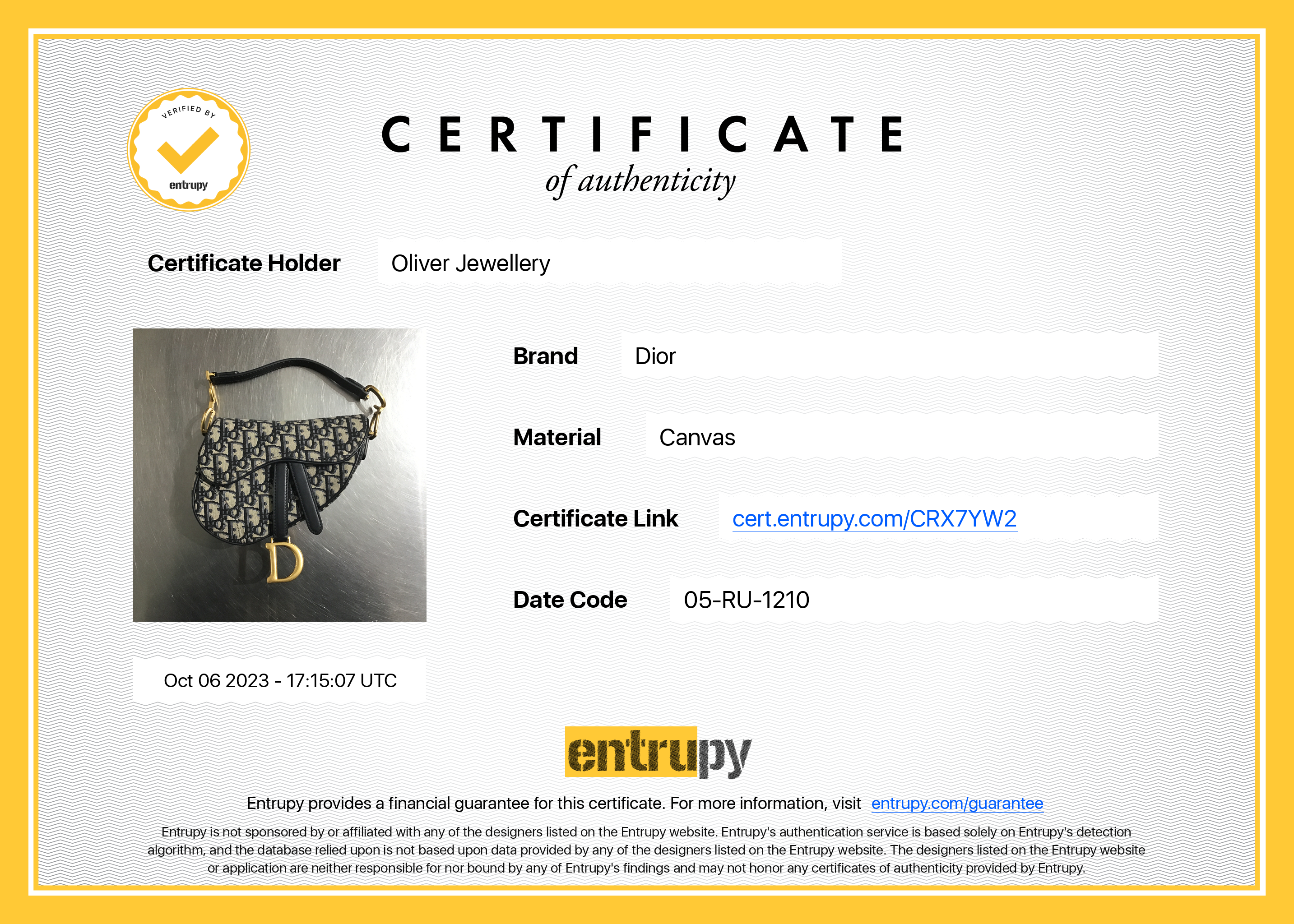 Entrupy Certificate of Authenticity