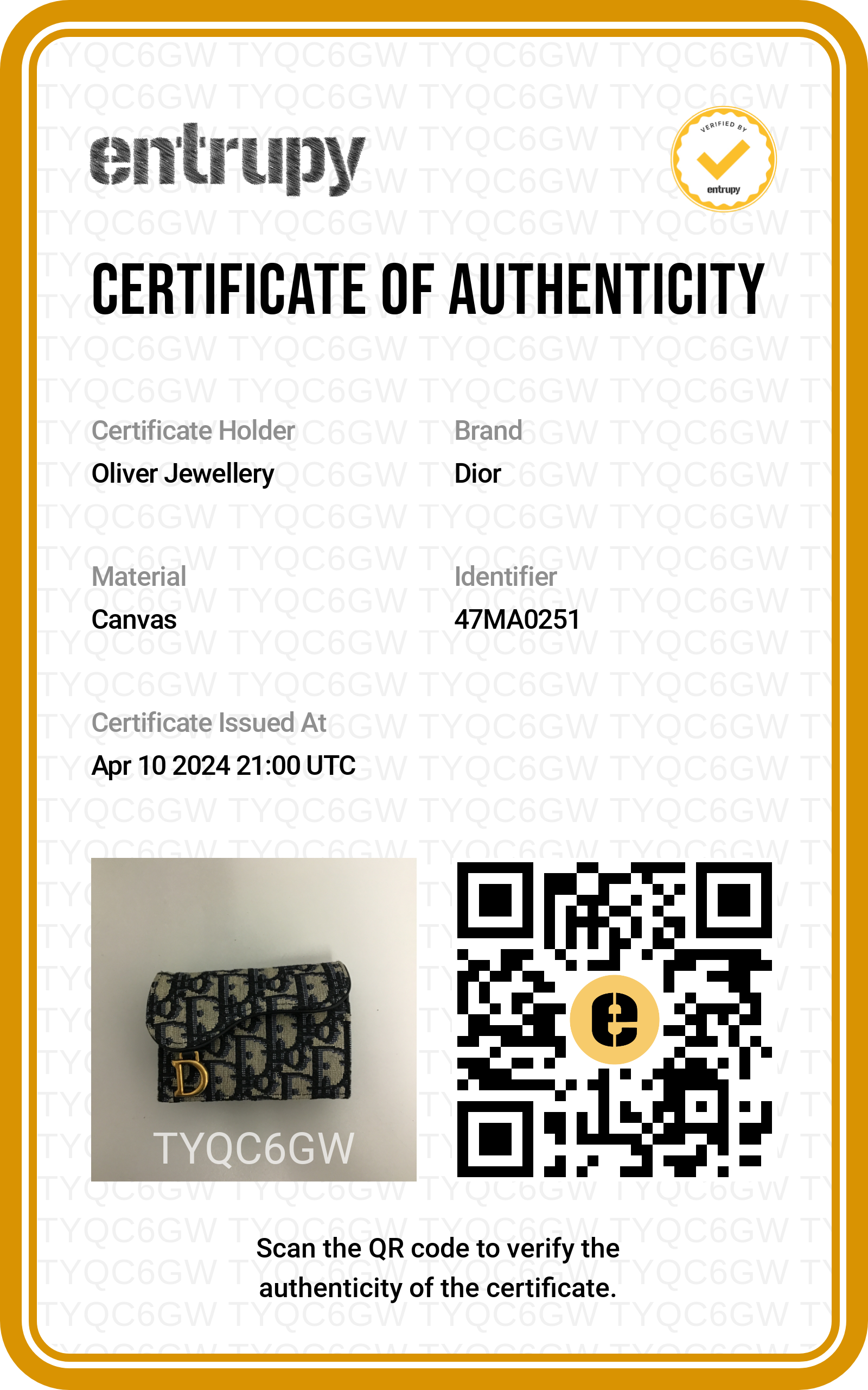 Dust Bag, Entrupy Certificate of Authenticty