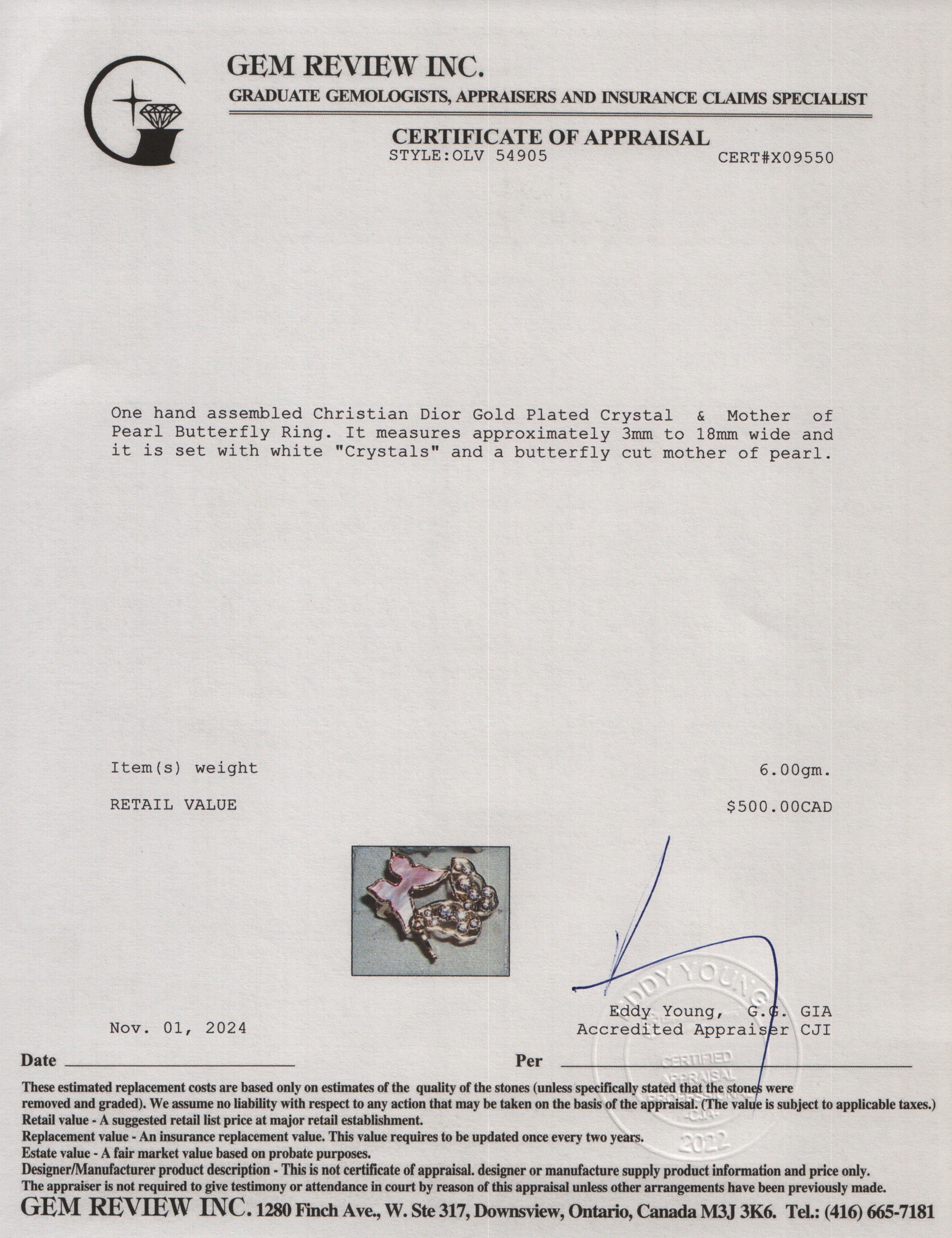 Gold Plated Crystal & Mother of Pearl Butterfly Ring, Size 6.5