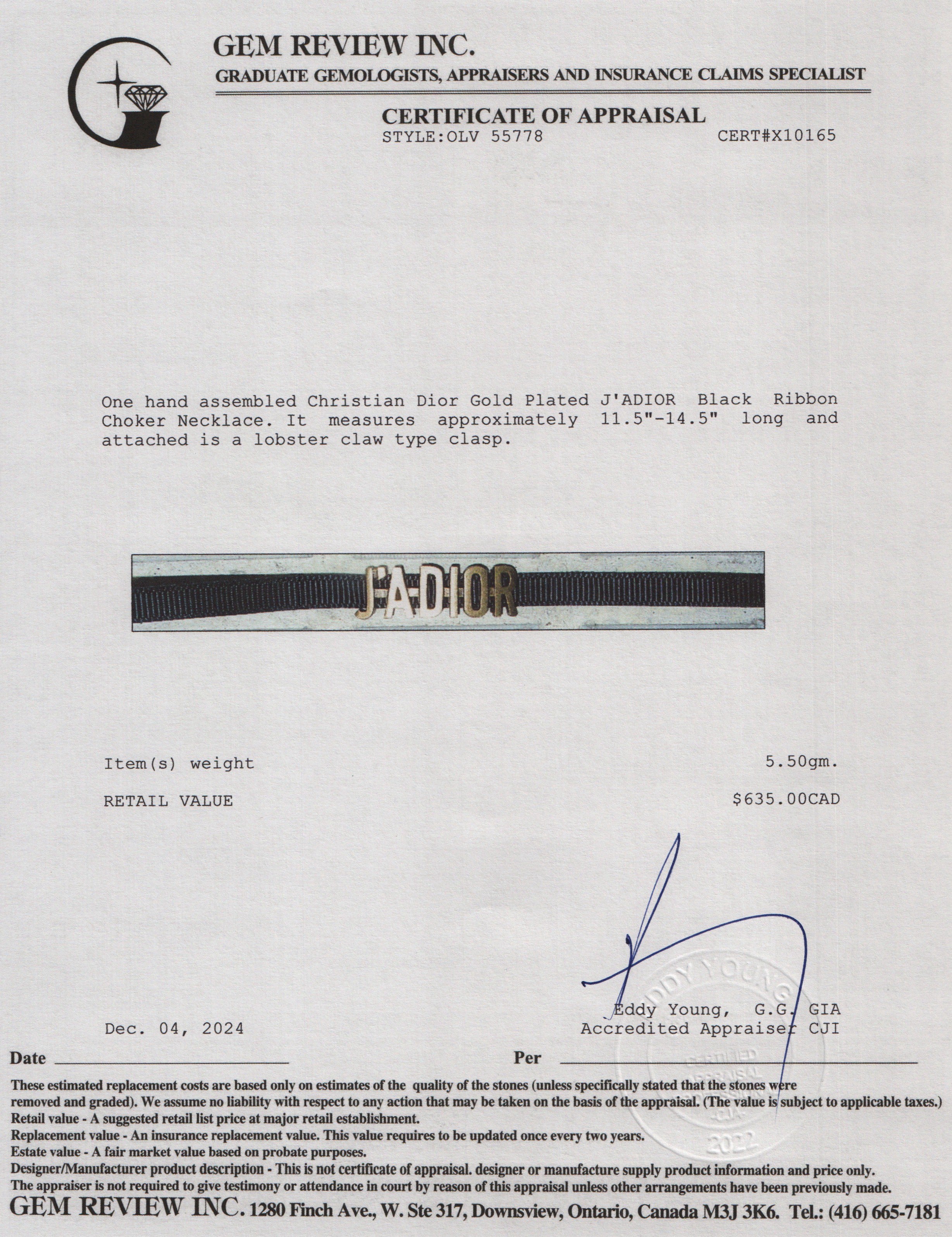 Gold Plated J'ADIOR Black Ribbon Choker Necklace