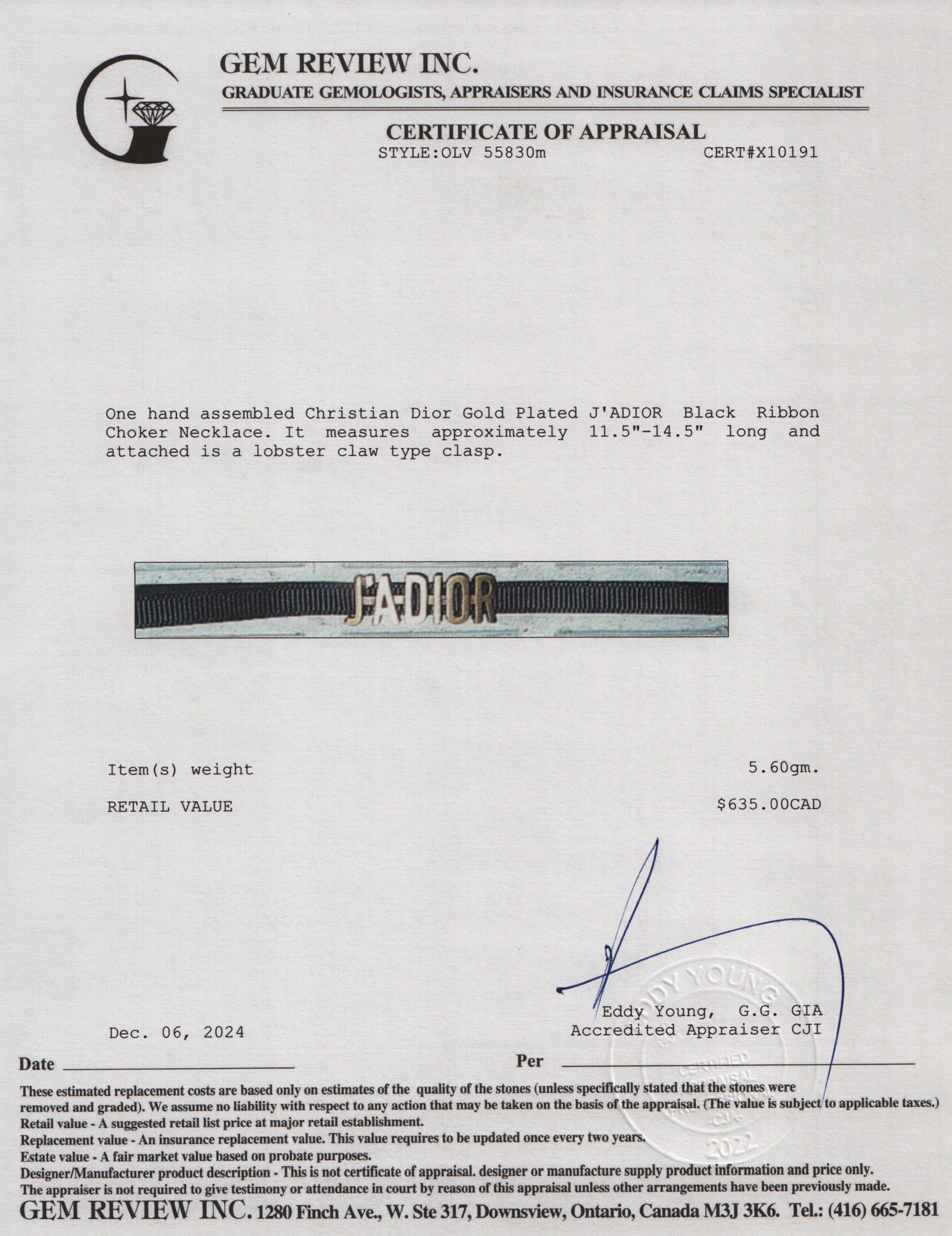 Gold Plated J'ADIOR Black Ribbon Choker Necklace w/ Box