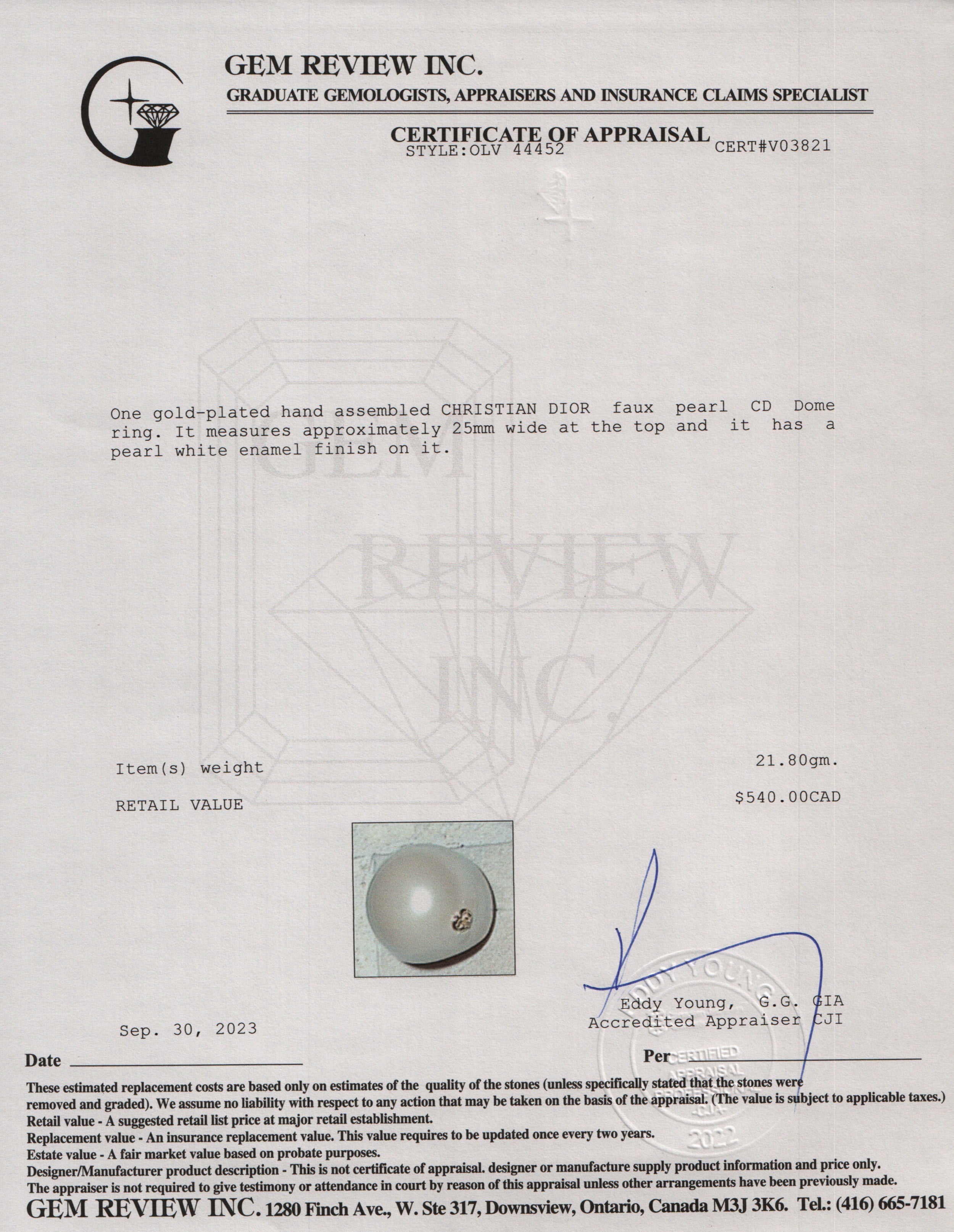 Gold Tone Metal Faux Pearl CD Dome Ring, L Size 6.5 w/ Box