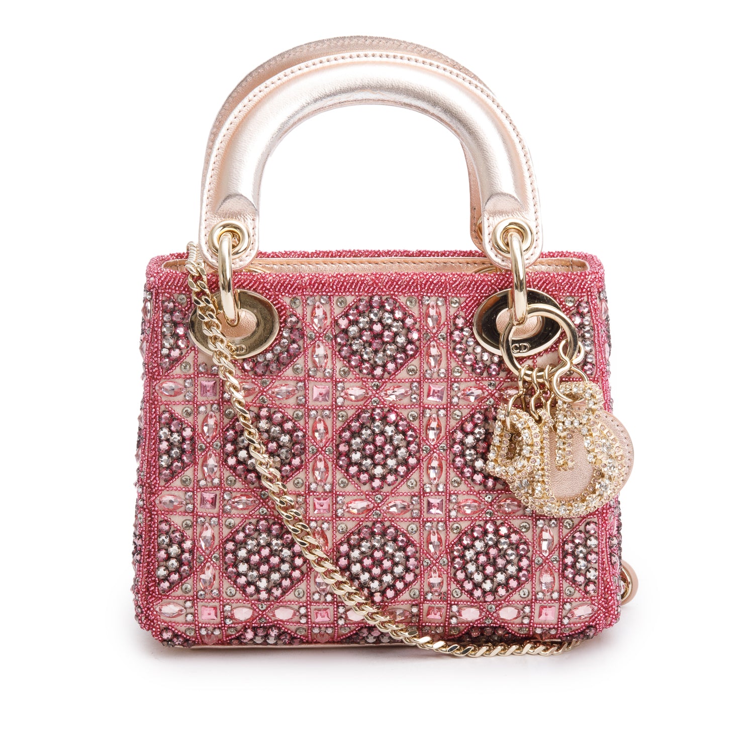 Pink Lambskin & Satin Embroidered Crystal Beads Mini Lady Dior Bag w/ Strap, Box & Authenticity Card
