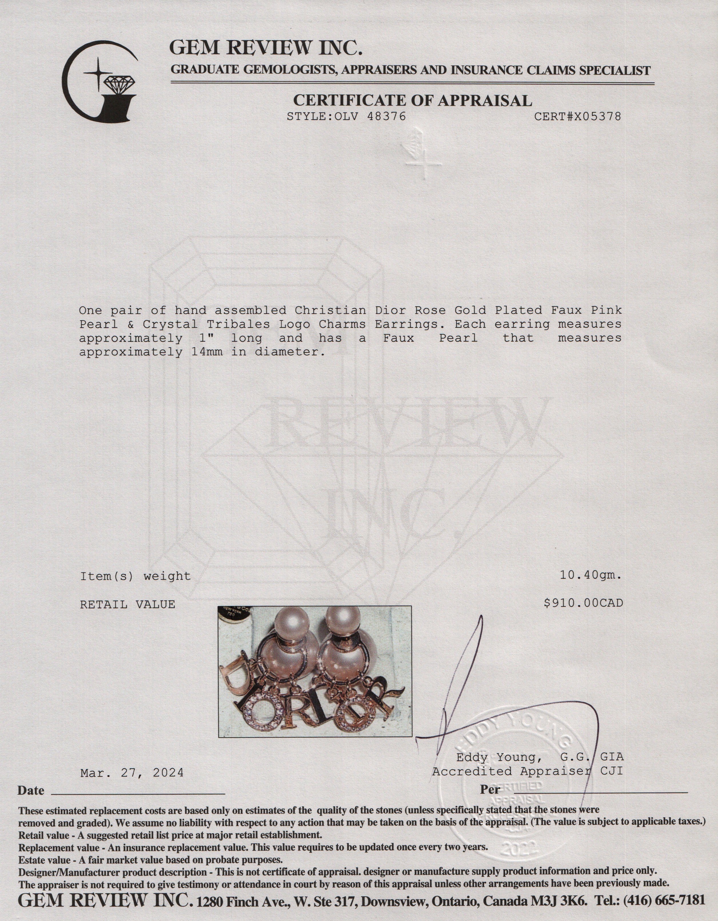 Rose Gold Plated Faux Pink Pearl & Crystal Tribales Logo Charms Earrings