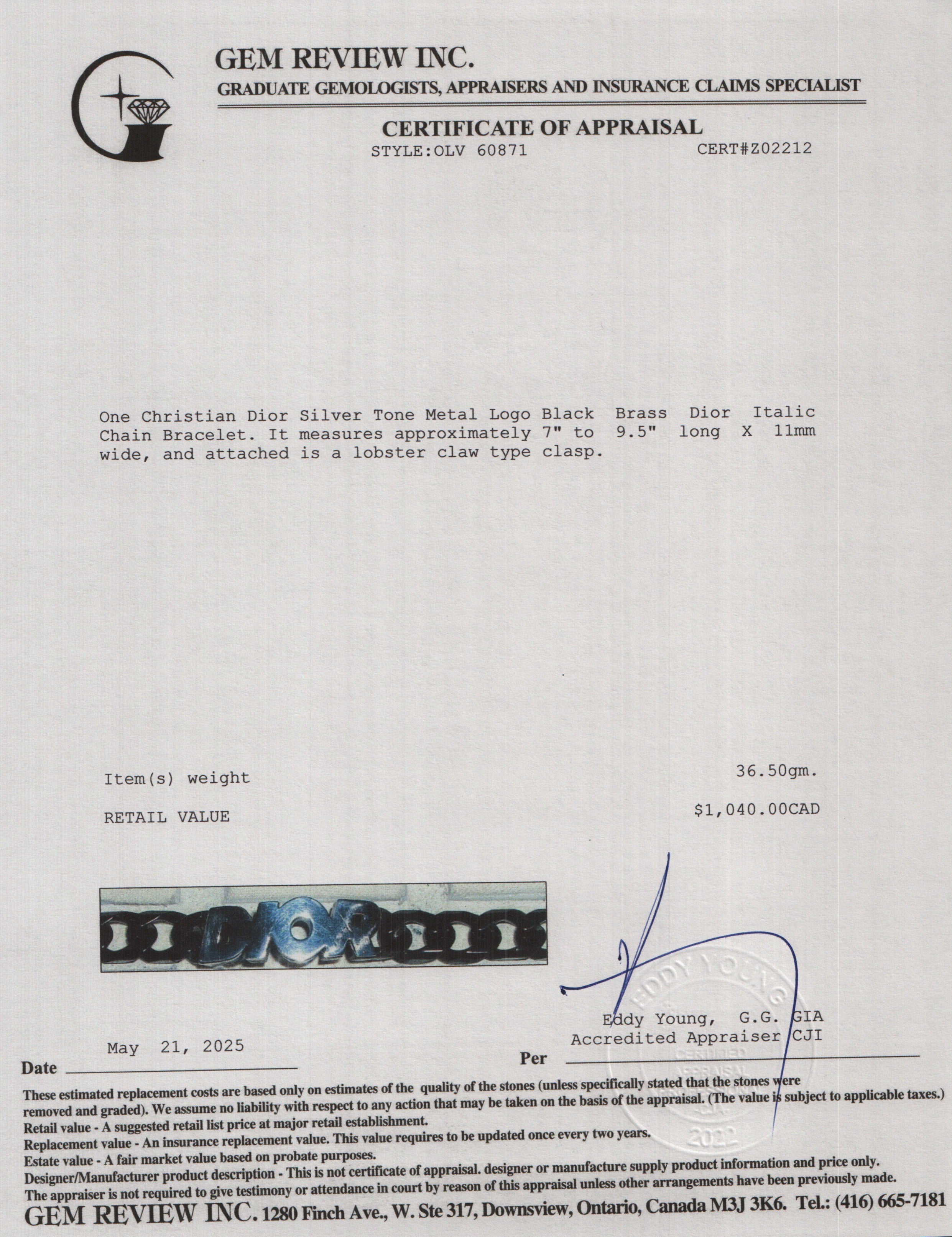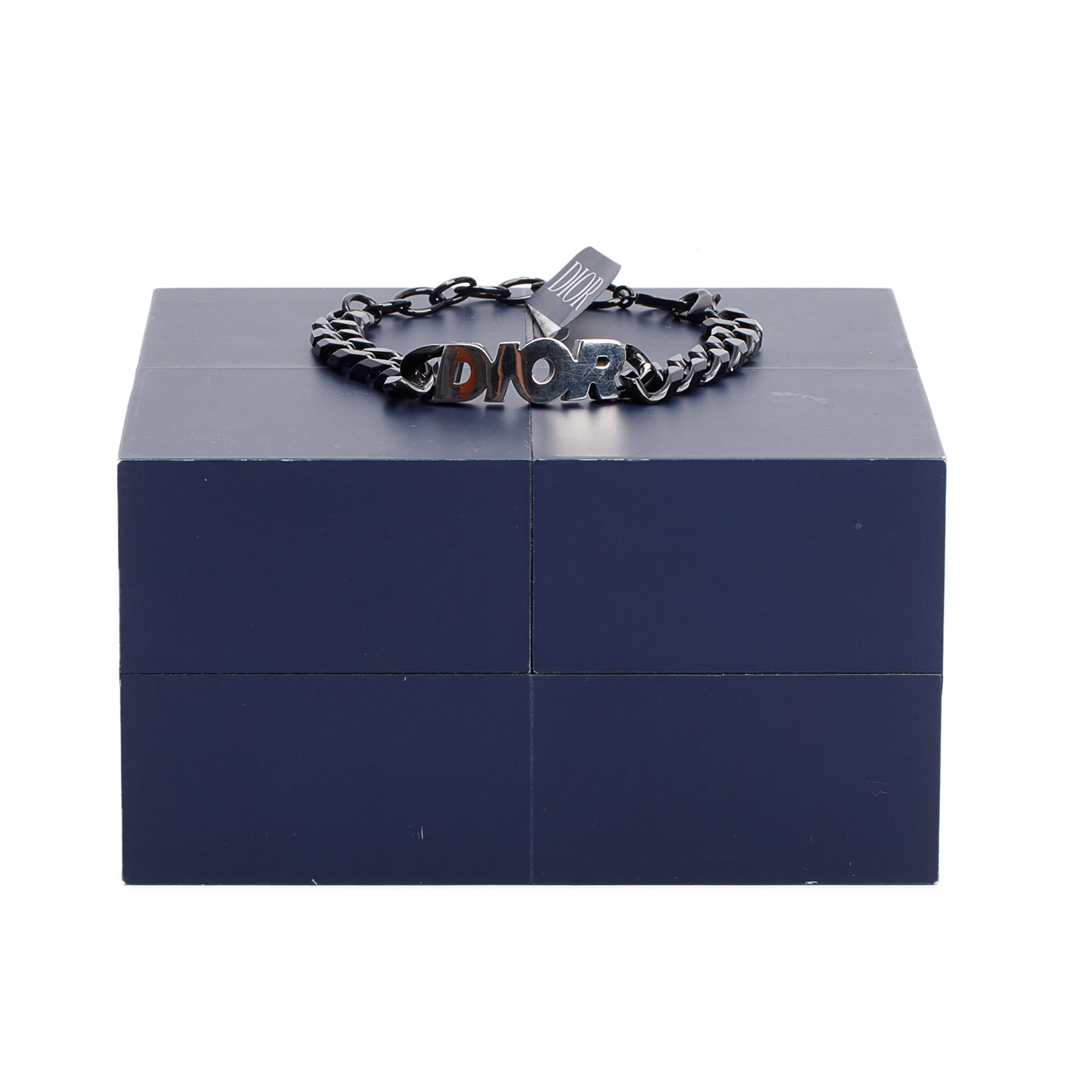 Silver Tone Metal Logo Black Brass Dior Italic Chain Bracelet w/ Box