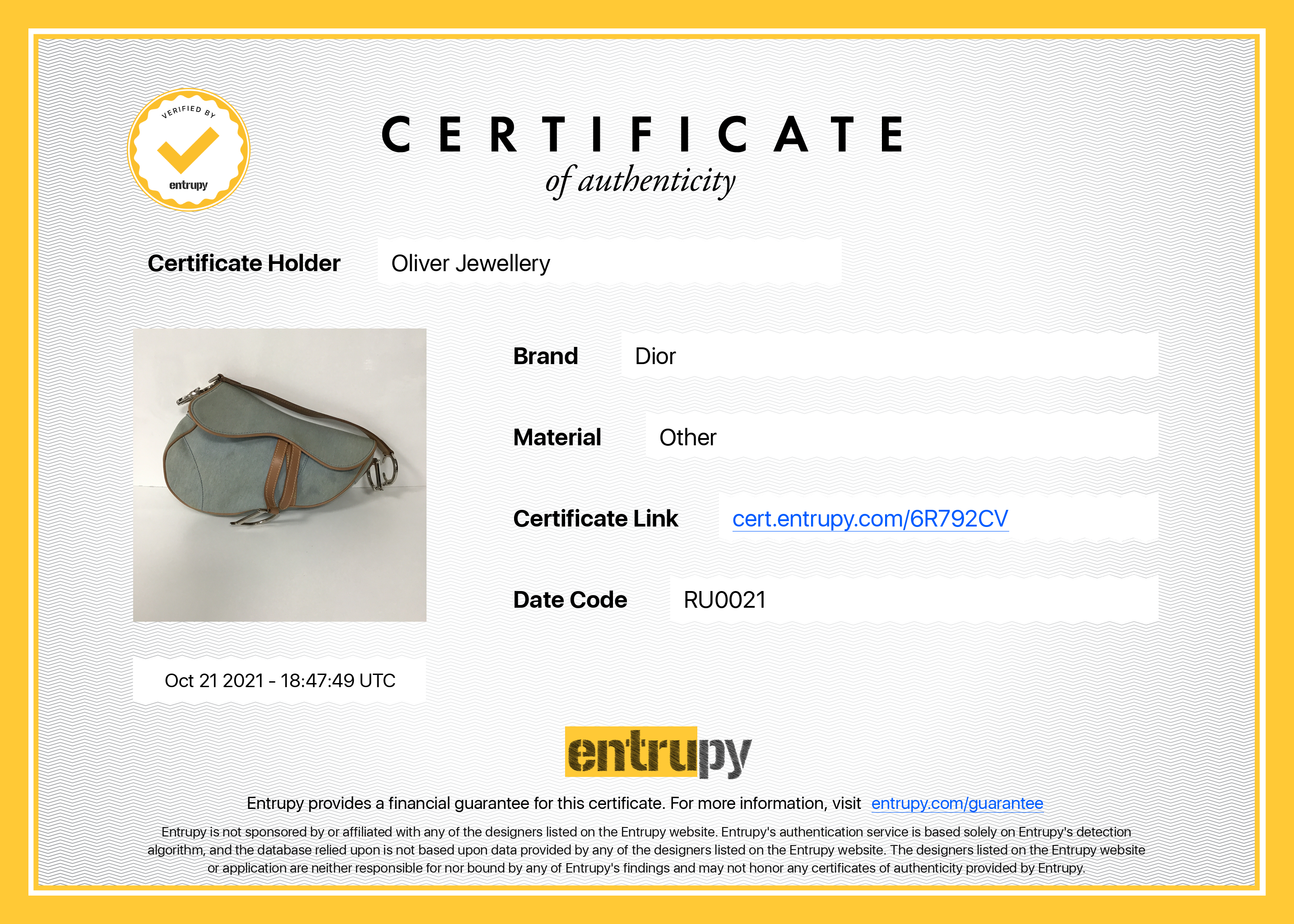 Included Items: Entrupy Certificate of Authenticity #: 6R792CV