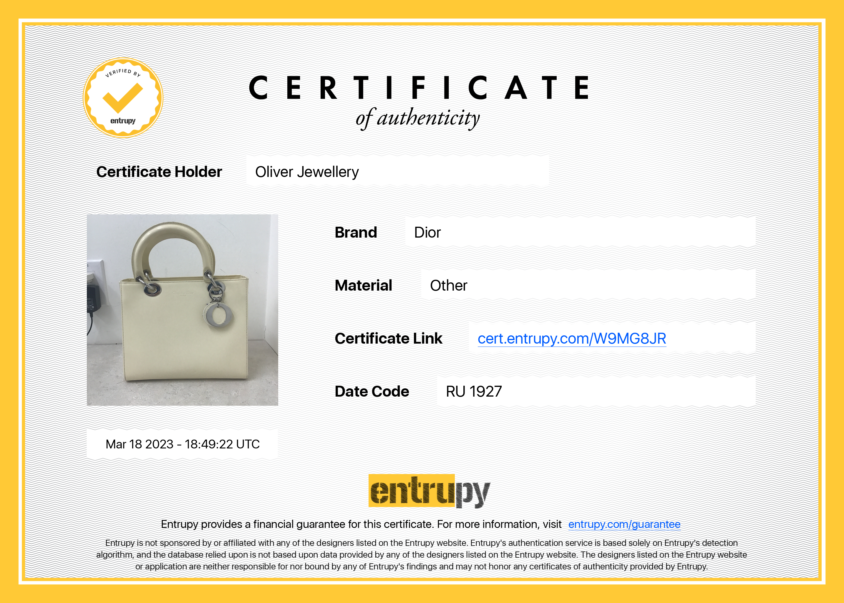 Included Items: Original Dior Authenticity Card, Booklet and Entrupy Certificate of Authenticity #: W9MG8JR