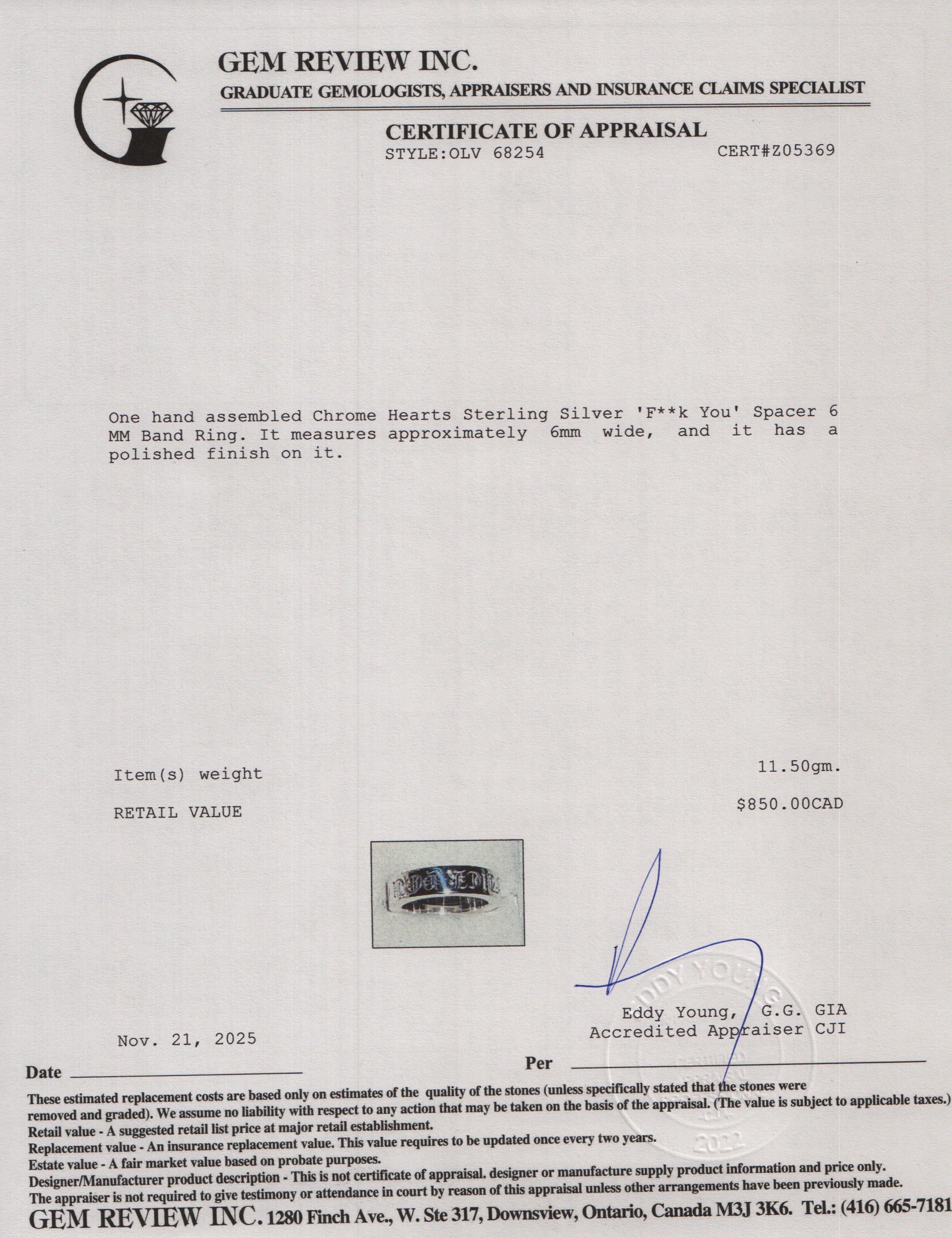 Sterling Silver 'F**k You' Spacer 6 MM Band Ring, Size 8