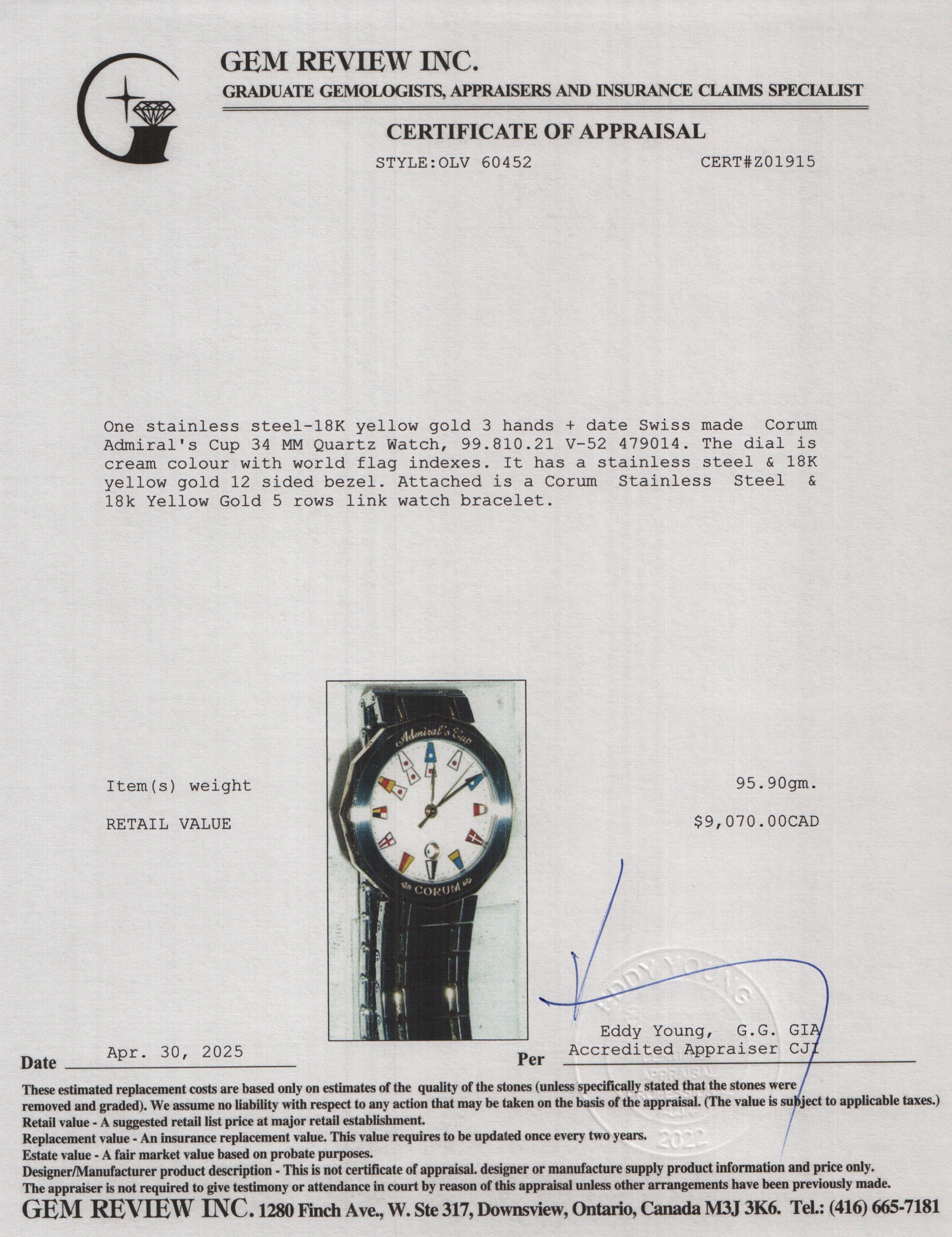 Stainless Steel & 18k Yellow Gold Admiral's Cup 34 MM Quartz Watch w/ Box & Papers