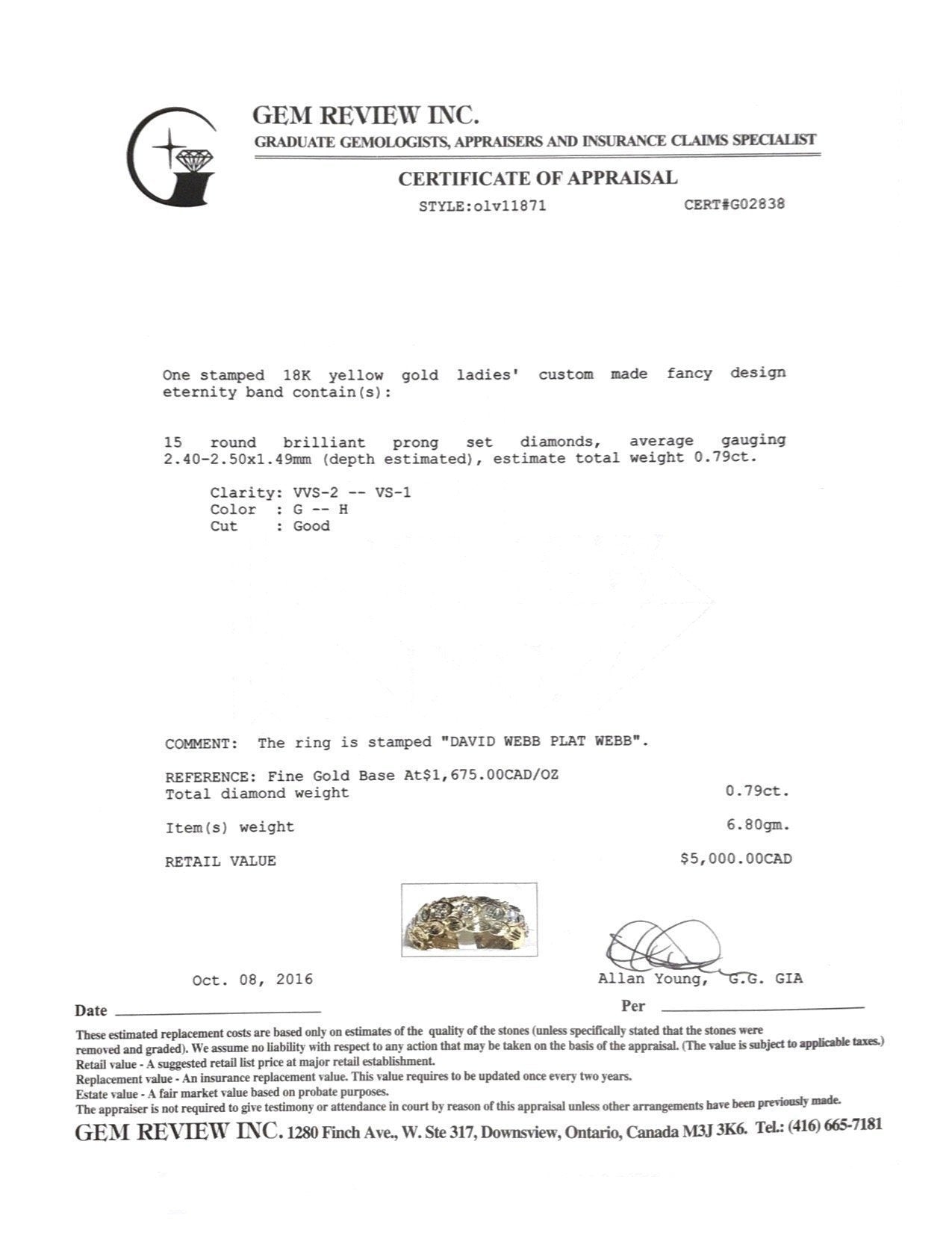 - 15 Round Brilliant Cut Diamonds Totaling Approximately 0.79 ct. of VVS2-VS1 Clarity, G-H Colour