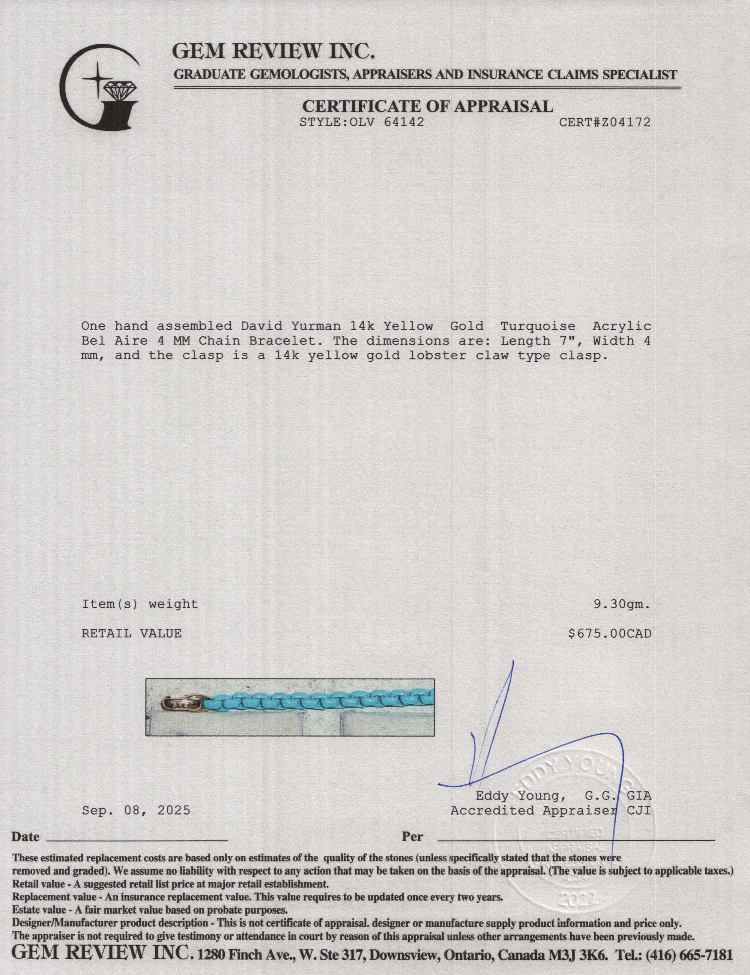 14k Yellow Gold Turquoise Acrylic Bel Aire 4 MM Chain Bracelet w/ Box
