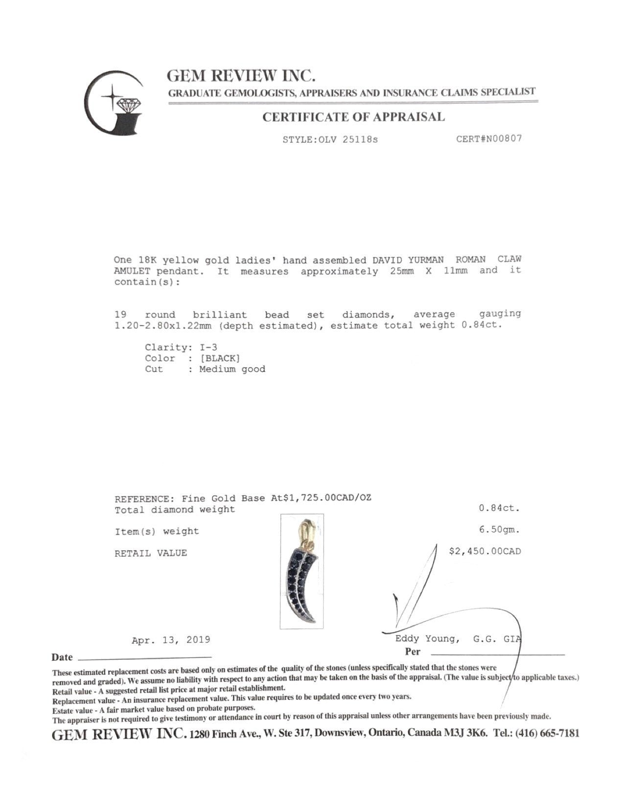 David Yurman 18k Gold Roman Claw Amulet Pendant with Black Diamonds