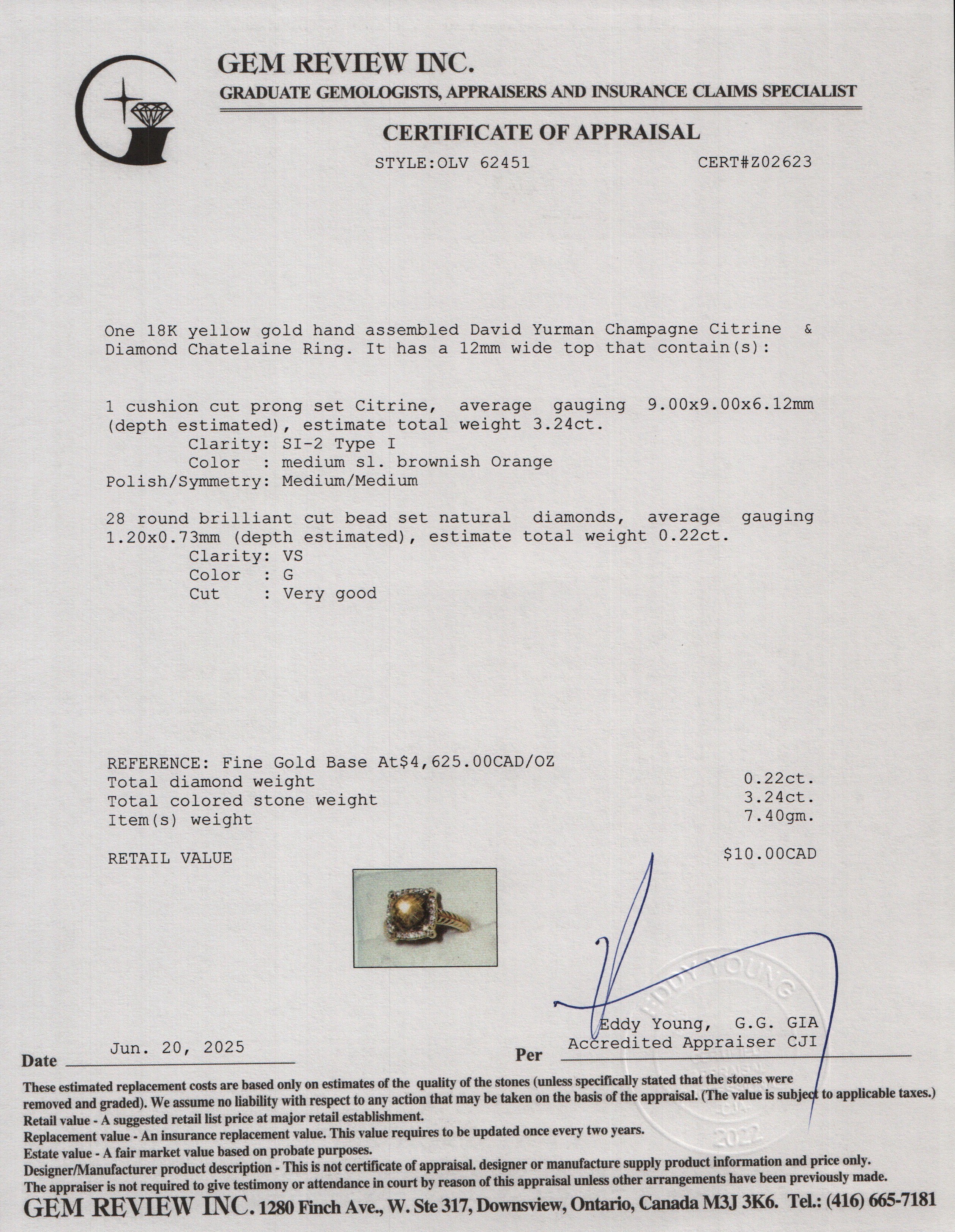 18k Yellow Gold Champagne Citrine & Diamond Chatelaine Ring, Size 5 w/ Box
