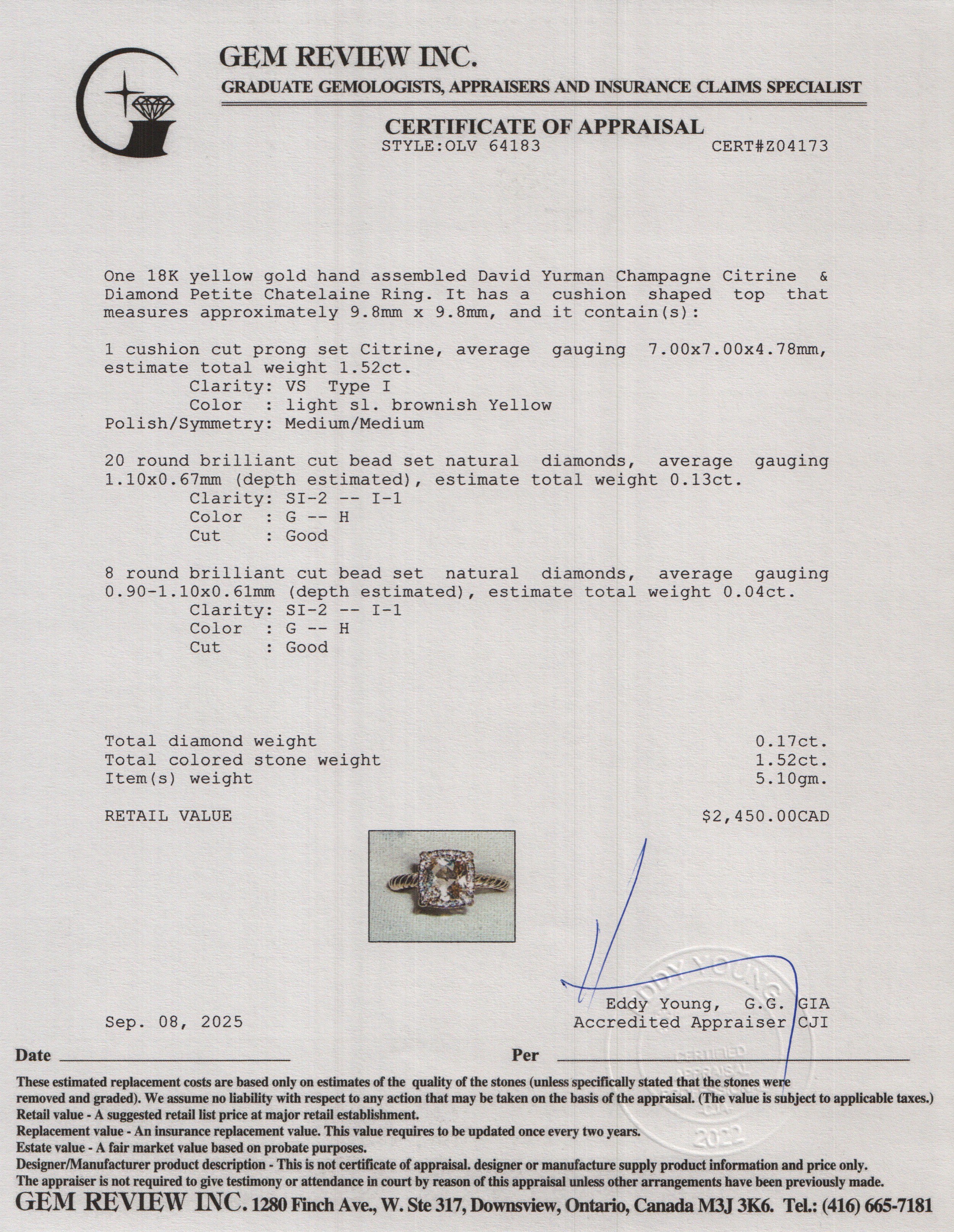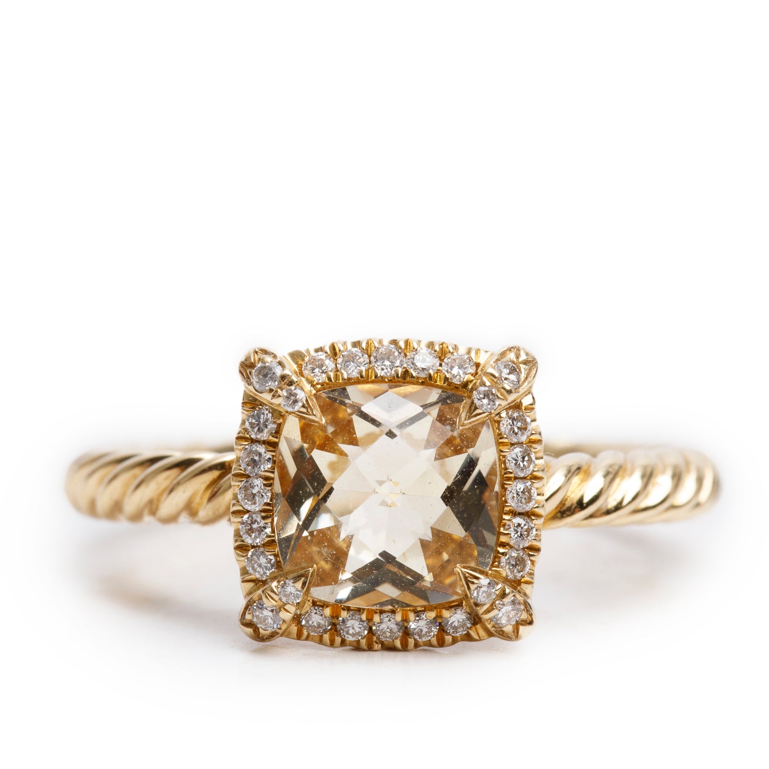 18k Yellow Gold Champagne Citrine & Diamond Petite Chatelaine Ring, Size 6 w/ Box
