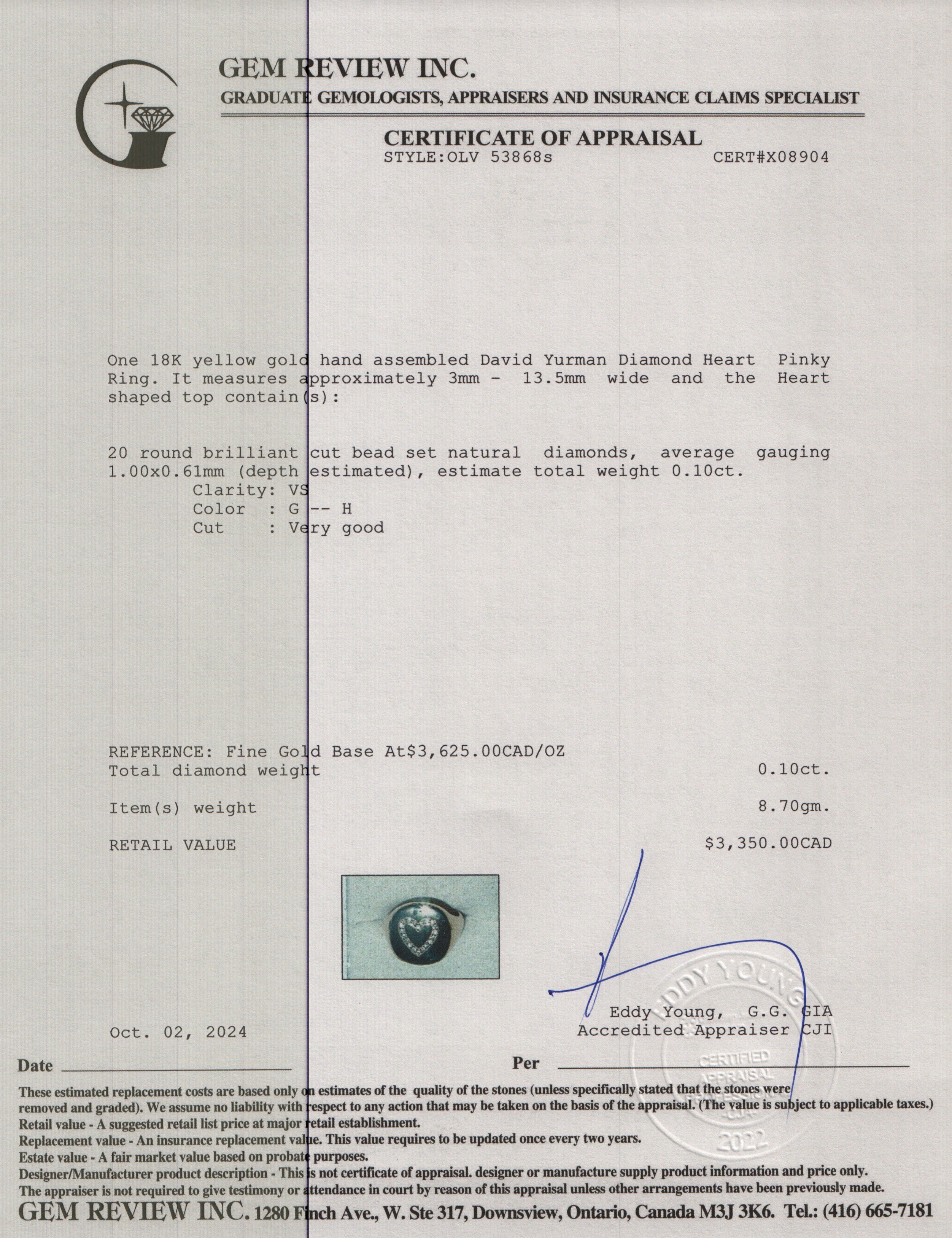 18k Yellow Gold Diamond Heart Pinky Ring, Size 3.5