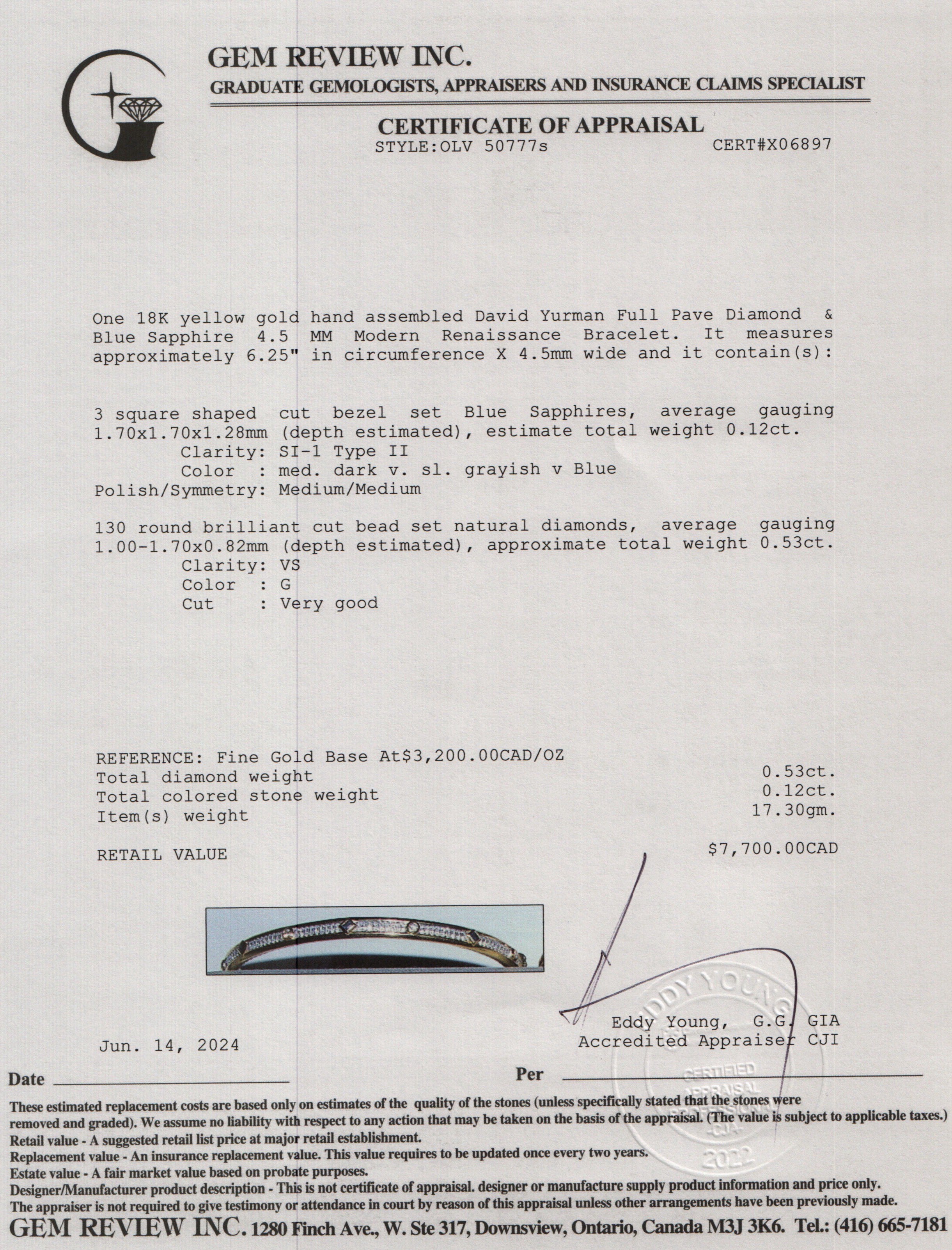 18k Yellow Gold Full Pave Diamond & Blue Sapphire 4.5 MM Modern Renaissance Bracelet w/ Box