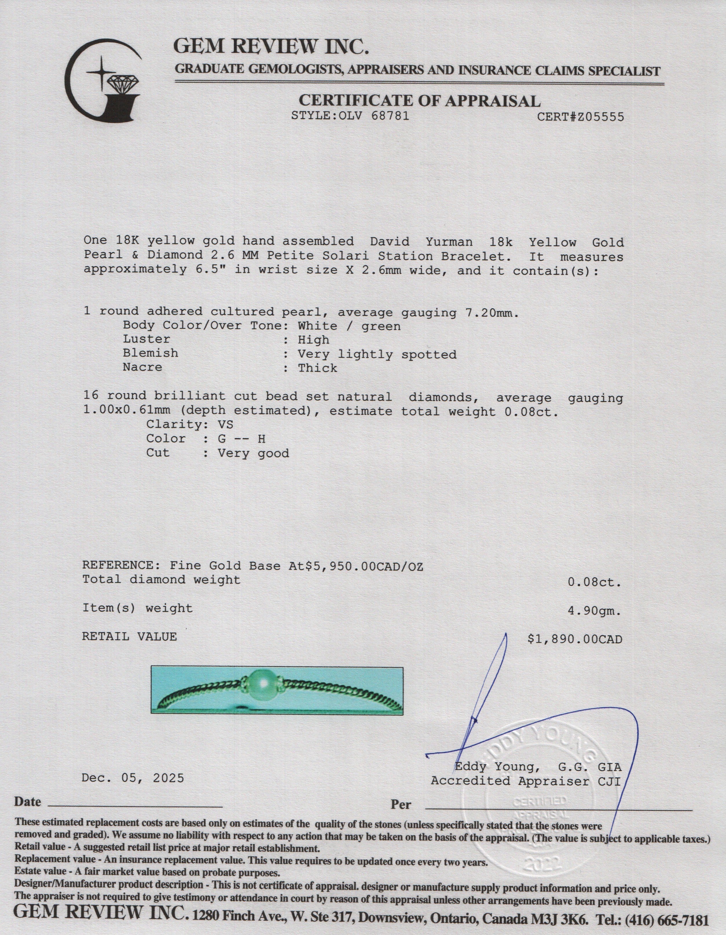 18k Yellow Gold Pearl & Diamond 2.6 MM Petite Solari Station Bracelet w/ Box